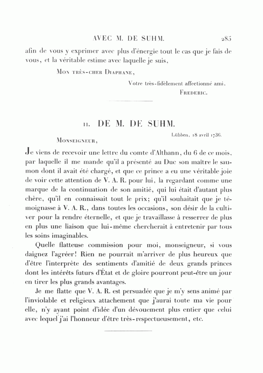 Quelle flatteuse commission pour moi, monseigneur, si vous daignez l'agréer! Rien ne pourrait m'arriver de plus heureux que d'être l'interprète des sentiments d'amitié de deux grands princes dont les intérêts futurs d'État et de gloire pourront peut-être un jour en tirer les plus grands avantages.