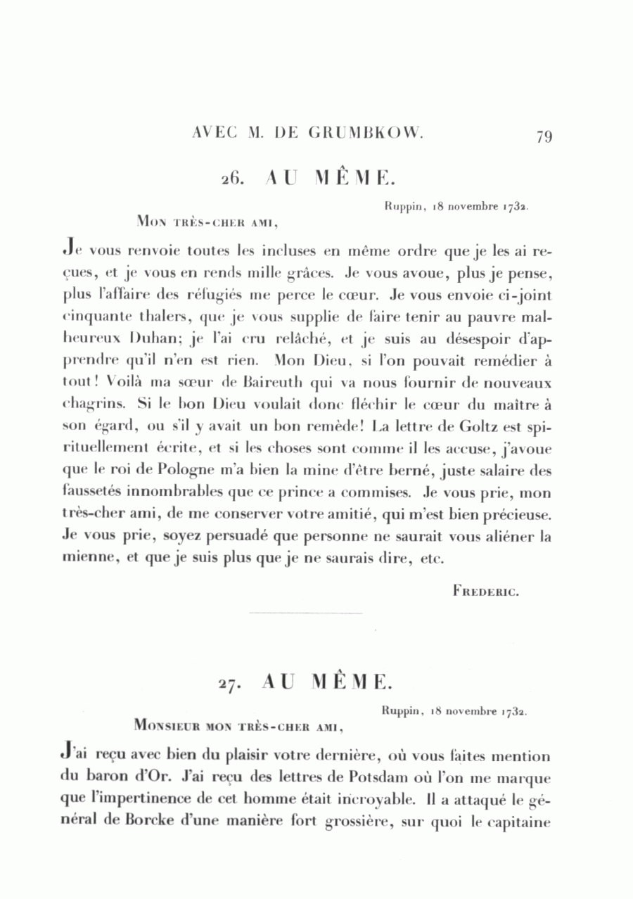 Je vous renvoie toutes les incluses en même ordre que je les ai reçues, et je vous en rends mille grâces. Je vous avoue, plus je pense, plus l'affaire des réfugiés me perce le cœur. Je vous envoie ci-joint cinquante thalers, que je vous supplie de faire tenir au pauvre malheureux Duhan; je l'ai cru relâché, et je suis au désespoir d'apprendre qu'il n'en est rien. Mon Dieu, si l'on pouvait remédier à tout! Voilà ma sœur de Baireuth qui va nous fournir de nouveaux chagrins. Si le bon Dieu voulait donc fléchir le cœur du maître à son égard, ou s'il y avait un bon remède! La lettre de Goltz est spirituellement écrite, et si les choses sont comme il les accuse, j'avoue que le roi de Pologne m'a bien la mine d'être berné, juste salaire des faussetés innombrables que ce prince a commises. Je vous prie, mon très-cher ami, de me conserver votre amitié, qui m'est bien précieuse. Je vous prie, soyez persuadé que personne ne saurait vous aliéner la mienne, et que je suis plus que je ne saurais dire, etc