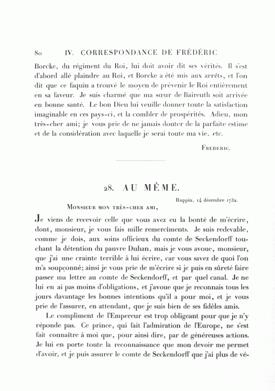 <80> Borcke, du régiment du Roi, lui doit avoir dit ses vérités. Il s'est d'abord allé plaindre au Roi, et Borcke a été mis aux arrêts, et l'on dit que ce faquin a trouvé le moyen de prévenir le Roi entièrement en sa faveur. Je suis charmé que ma sœur de Baireuth soit arrivée en bonne santé. Le bon Dieu lui veuille donner toute la satisfaction imaginable en ces pays-ci, et la combler de prospérités. Adieu, mon très-cher ami; je vous prie de ne jamais douter de la parfaite estime et de la considération avec laquelle je serai toute ma vie, etc.