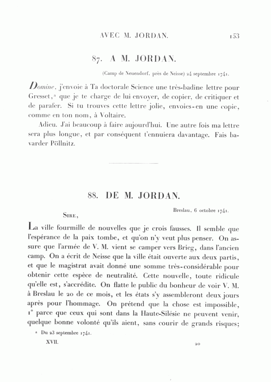 Domine, j'envoie à Ta doctorale Science une très-badine lettre pour Gresset,a que je te charge de lui envoyer, de copier, de critiquer et de parafer. Si tu trouves cette lettre jolie, envoies-en une copie, comme en ton nom, à Voltaire.