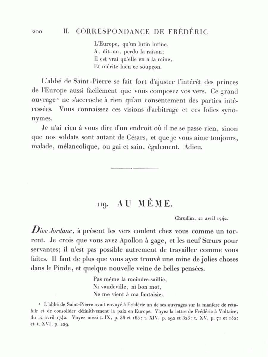 a L'abbé de Saint-Pierre avait envoyé à Frédéric un de ses ouvrages sur la manière de rétablir et de consolider définitivement la paix en Europe. Voyez la lettre de Frédéric à Voltaire, du 12 avril 1742. Voyez aussi t. IX, p. 36 et 165; t. XIV, p. 292 et 323 : t. XV, p. 71 et 152 : et t. XVI, p. 229.