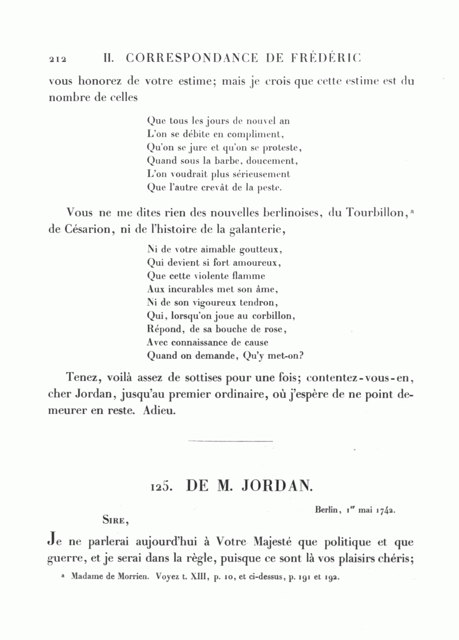 Tenez, voilà assez de sottises pour une fois; contentez-vous-en, cher Jordan, jusqu'au premier ordinaire, où j'espère de ne point demeurer en reste. Adieu.