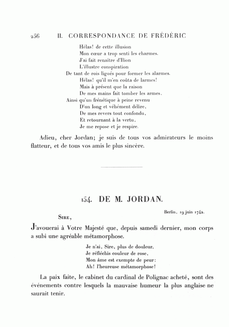 Adieu, cher Jordan; je suis de tous vos admirateurs le moins flatteur, et de tous vos amis le plus sincère.