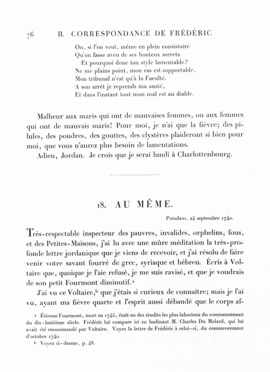 Très-respectable inspecteur des pauvres, invalides, orphelins, fous, et des Petites-Maisons, j'ai lu avec une mûre méditation la très-profonde lettre jordanique que je viens de recevoir, et j'ai résolu de faire venir votre savant fourré de grec, syriaque et hébreu. Écris à Voltaire que, quoique je l'aie refusé, je me suis ravisé, et que je voudrais de son petit Fourmont diminutif.a
