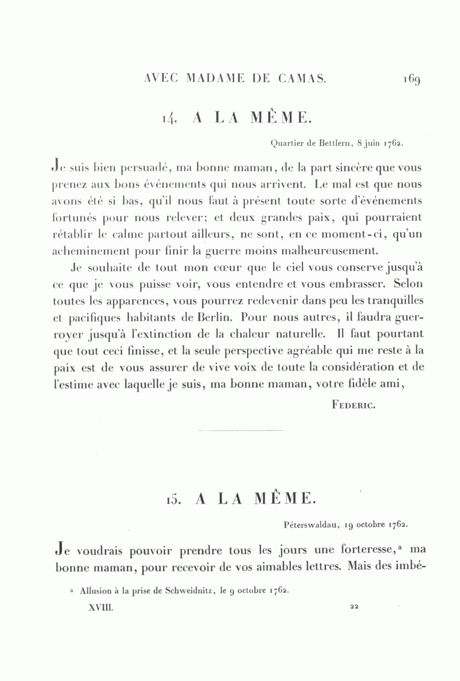 Je souhaite de tout mon cœur que le ciel vous conserve jusqu'à ce que je vous puisse voir, vous entendre et vous embrasser. Selon toutes les apparences, vous pourrez redevenir dans peu les tranquilles et pacifiques habitants de Berlin. Pour nous autres, il faudra guerroyer jusqu'à l'extinction de la chaleur naturelle. Il faut pourtant que tout ceci finisse, et la seule perspective agréable qui me reste à la paix est de vous assurer de vive voix de toute la considération et de l'estime avec laquelle je suis, ma bonne maman, votre fidèle ami,