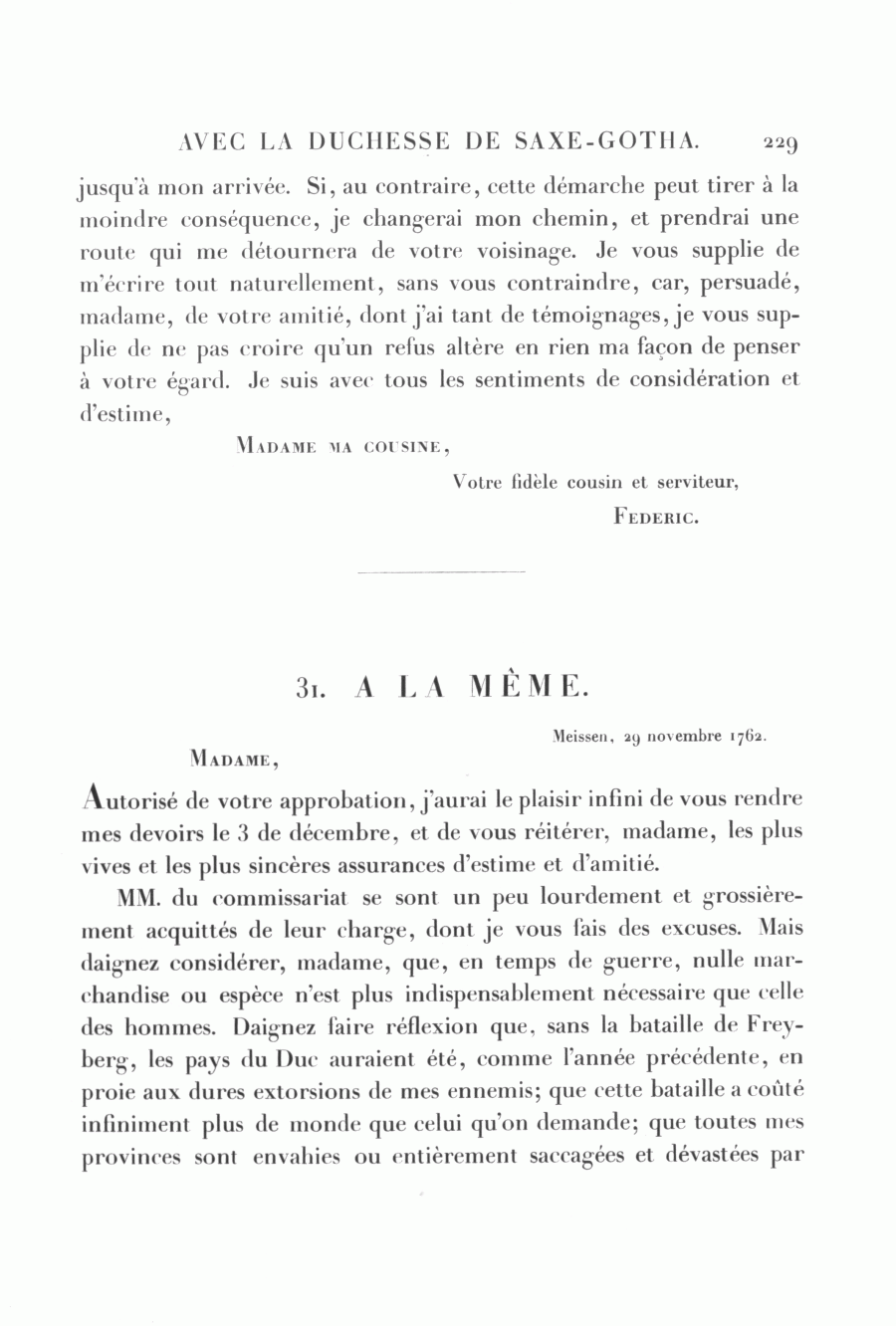 MM. du commissariat se sont un peu lourdement et grossièrement acquittés de leur charge, dont je vous fais des excuses. Mais daignez considérer, madame, que, en temps de guerre, nulle marchandise ou espèce n'est plus indispensablement nécessaire que celle des hommes. Daignez faire réflexion que, sans la bataille de Freyberg, les pays du Duc auraient été, comme l'année précédente, en proie aux dures extorsions de mes ennemis; que cette bataille a coûté infiniment plus de monde que celui qu'on demande; que toutes mes provinces sont envahies ou entièrement saccagées et dévastées par