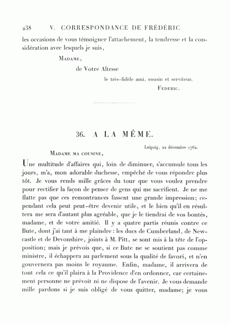 Une multitude d'affaires qui, loin de diminuer, s'accumule tous les jours, m'a, mon adorable duchesse, empêché de vous répondre plus tôt. Je vous rends mille grâces du tour que vous voulez prendre pour rectifier la façon de penser de gens qui me sacrifient. Je ne me flatte pas que ces remontrances fassent une grande impression; cependant cela peut peut-être devenir utile, et le bien qu'il en résultera me sera d'autant plus agréable, que je le tiendrai de vos bontés, madame, et de votre amitié. Il y a quatre partis réunis contre ce Bute, dont j'ai tant à me plaindre : les ducs de Cumberland, de Newcastle et de Devonshire, joints à M. Pitt, se sont mis à la tête de l'opposition; mais je prévois que, si ce Bute ne se soutient pas comme ministre, il échappera au parlement sous la qualité de favori, et n'en gouvernera pas moins le royaume. Enfin, madame, il arrivera de tout cela ce qu'il plaira à la Providence d'en ordonner, car certainement personne ne prévoit ni ne dispose de l'avenir. Je vous demande mille pardons si je suis obligé de vous quitter, madame; je vous