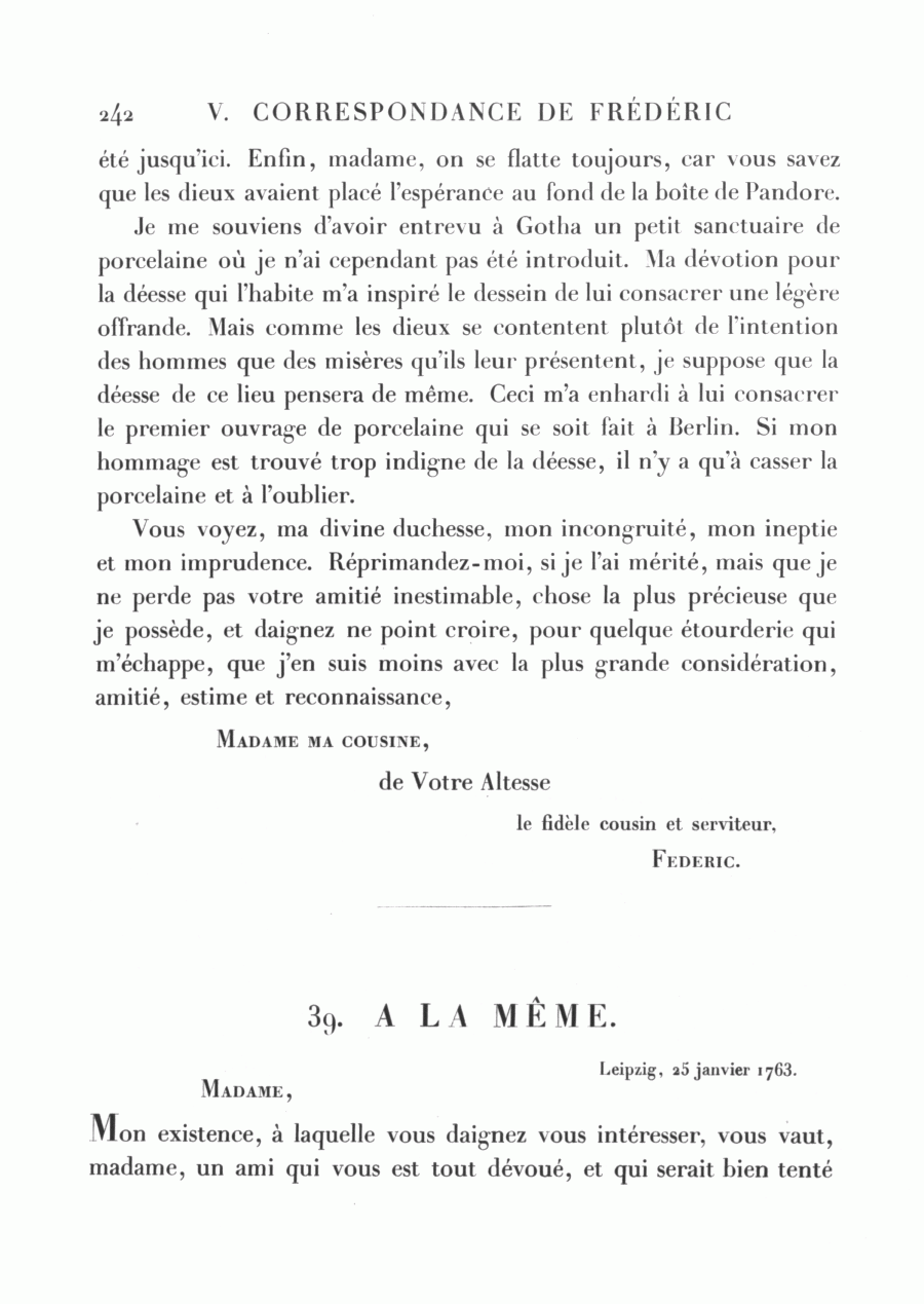 Je me souviens d'avoir entrevu à Gotha un petit sanctuaire de porcelaine où je n'ai cependant pas été introduit. Ma dévotion pour la déesse qui l'habite m'a inspiré le dessein de lui consacrer une légère offrande. Mais comme les dieux se contentent plutôt de l'intention des hommes que des misères qu'ils leur présentent, je suppose que la déesse de ce lieu pensera de même. Ceci m'a enhardi à lui consacrer le premier ouvrage de porcelaine qui se soit fait à Berlin. Si mon hommage est trouvé trop indigne de la déesse, il n'y a qu'à casser la porcelaine et à l'oublier.