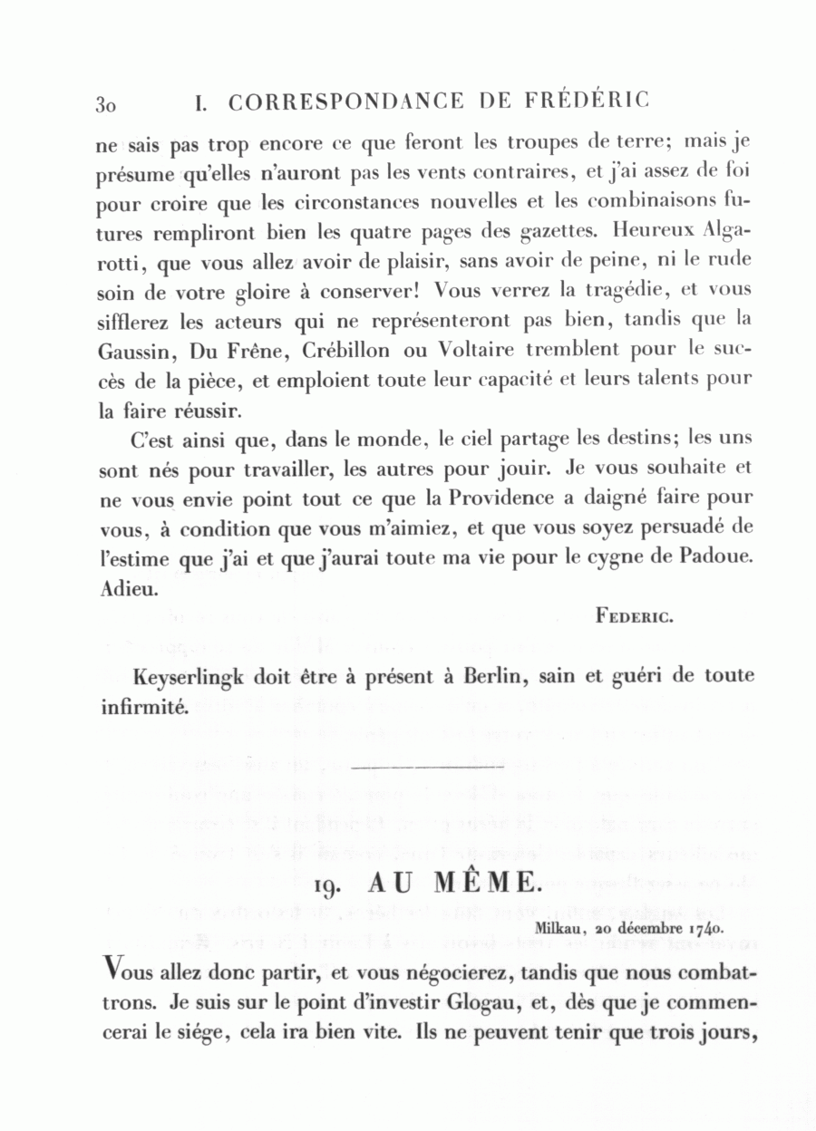 <30> ne sais pas trop encore ce que feront les troupes de terre; mais je présume qu'elles n'auront pas les vents contraires, et j'ai assez de foi pour croire que les circonstances nouvelles et les combinaisons futures rempliront bien les quatre pages des gazettes. Heureux Algarotti, que vous allez avoir de plaisir, sans avoir de peine, ni le rude soin de votre gloire à conserver! Vous verrez la tragédie, et vous sifflerez les acteurs qui ne représenteront pas bien, tandis que la Gaussin, Du Frêne, Crébillon ou Voltaire tremblent pour le succès de la pièce, et emploient toute leur capacité et leurs talents pour la faire réussir.