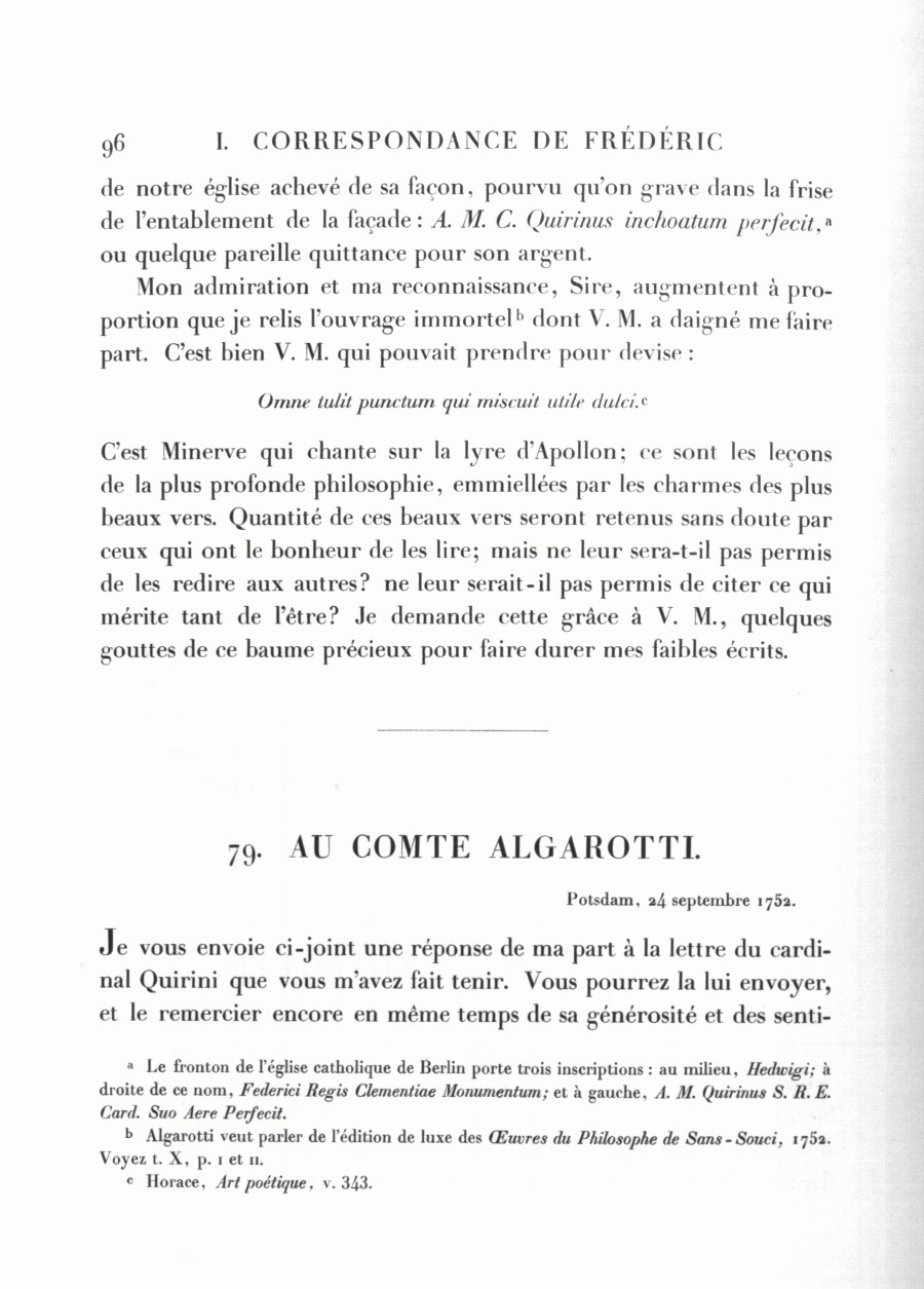 Mon admiration et ma reconnaissance, Sire, augmentent à proportion que je relis l'ouvrage immortelb dont V. M. a daigné me faire part. C'est bien V. M. qui pouvait prendre pour devise :