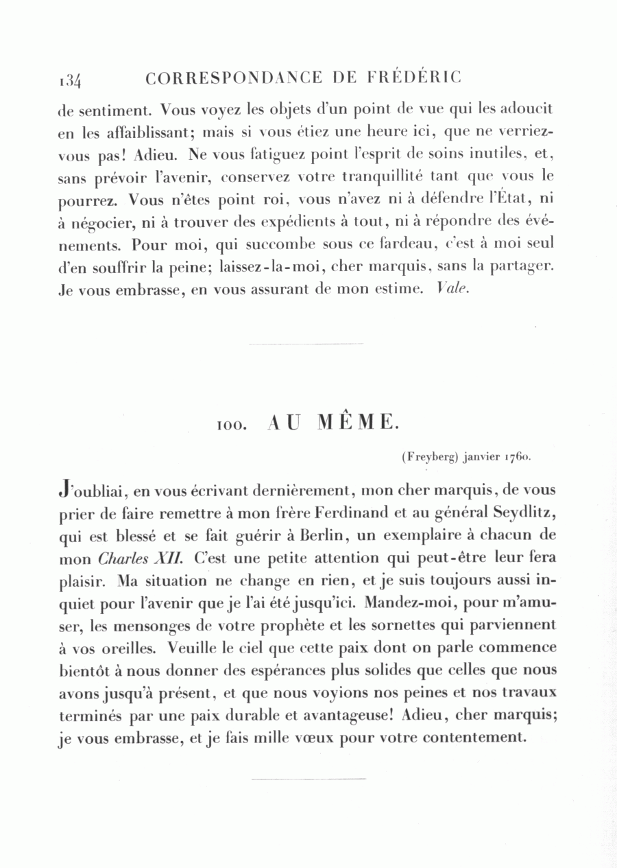 J'oubliai, en vous écrivant dernièrement, mon cher marquis, de vous prier de faire remettre à mon frère Ferdinand et au général Seydlitz, qui est blessé et se fait guérir à Berlin, un exemplaire à chacun de mon Charles XII. C'est une petite attention qui peut-être leur fera plaisir. Ma situation ne change en rien, et je suis toujours aussi inquiet pour l'avenir que je l'ai été jusqu'ici. Mandez-moi, pour m'amuser, les mensonges de votre prophète et les sornettes qui parviennent à vos oreilles. Veuille le ciel que cette paix dont on parle commence bientôt à nous donner des espérances plus solides que celles que nous avons jusqu'à présent, et que nous voyions nos peines et nos travaux terminés par une paix durable et avantageuse! Adieu, cher marquis; je vous embrasse, et je fais mille vœux pour votre contentement.