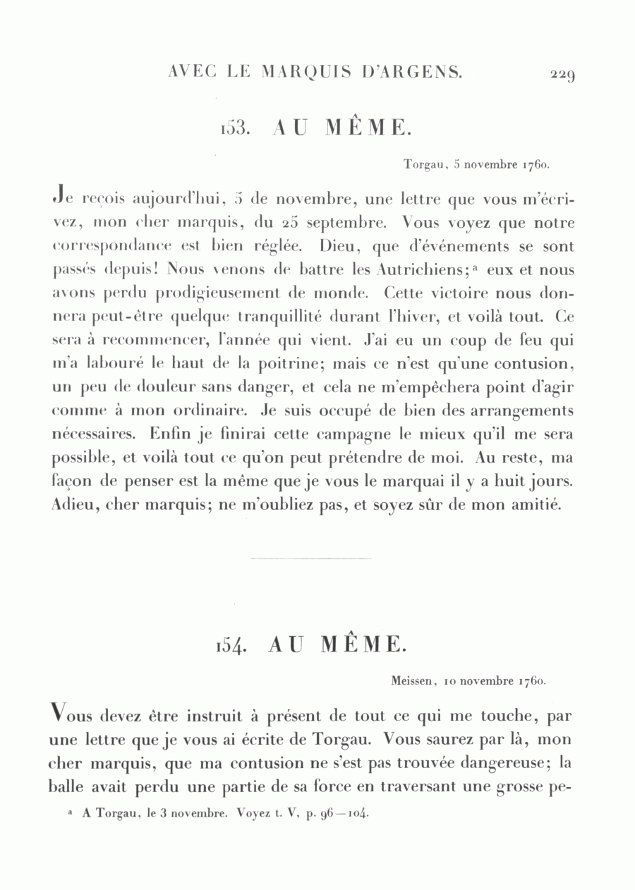 Vous devez être instruit à présent de tout ce qui me touche, par une lettre que je vous ai écrite de Torgau. Vous saurez par là, mon cher marquis, que ma contusion ne s'est pas trouvée dangereuse; la balle avait perdu une partie de sa force en traversant une grosse pe-