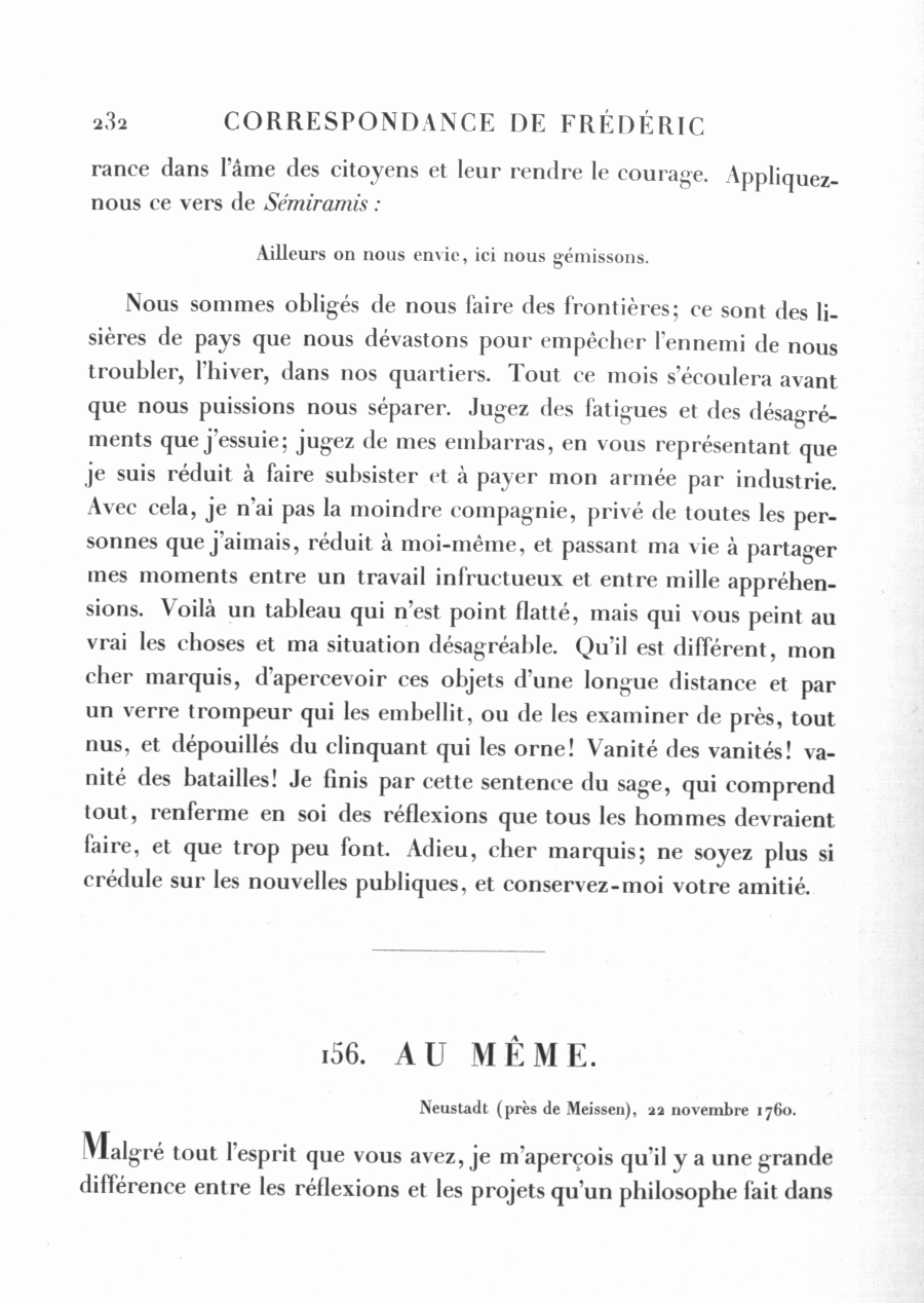 Ailleurs on nous envie, ici nous gémissons.Nous sommes obligés de nous faire des frontières; ce sont des lisières de pays que nous dévastons pour empêcher l'ennemi de nous troubler, l'hiver, dans nos quartiers. Tout ce mois s'écoulera avant que nous puissions nous séparer. Jugez des fatigues et des désagréments que j'essuie; jugez de mes embarras, en vous représentant que je suis réduit à faire subsister et à payer mon armée par industrie. Avec cela, je n'ai pas la moindre compagnie, privé de toutes les personnes que j'aimais, réduit à moi-même, et passant ma vie à partager mes moments entre un travail infructueux et entre mille appréhensions. Voilà un tableau qui n'est point flatté, mais qui vous peint au vrai les choses et ma situation désagréable. Qu'il est différent, mon cher marquis, d'apercevoir ces objets d'une longue distance et par un verre trompeur qui les embellit, ou de les examiner de près, tout nus, et dépouillés du clinquant qui les orne! Vanité des vanités! vanité des batailles! Je finis par cette sentence du sage, qui comprend tout, renferme en soi des réflexions que tous les hommes devraient faire, et que trop peu font. Adieu, cher marquis; ne soyez plus si crédule sur les nouvelles publiques, et conservez-moi votre amitié.