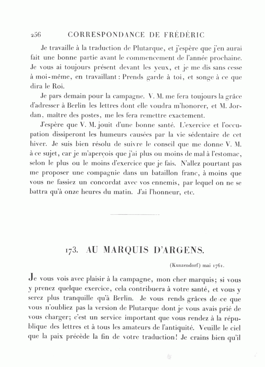 Je vous vois avec plaisir à la campagne, mon cher marquis; si vous y prenez quelque exercice, cela contribuera à votre santé, et vous y serez plus tranquille qu'à Berlin. Je vous rends grâces de ce que vous n'oubliez pas la version de Plutarque dont je vous avais prié de vous charger; c'est un service important que vous rendez à la république des lettres et à tous les amateurs de l'antiquité. Veuille le ciel que la paix précède la fin de votre traduction! Je crains bien qu'il