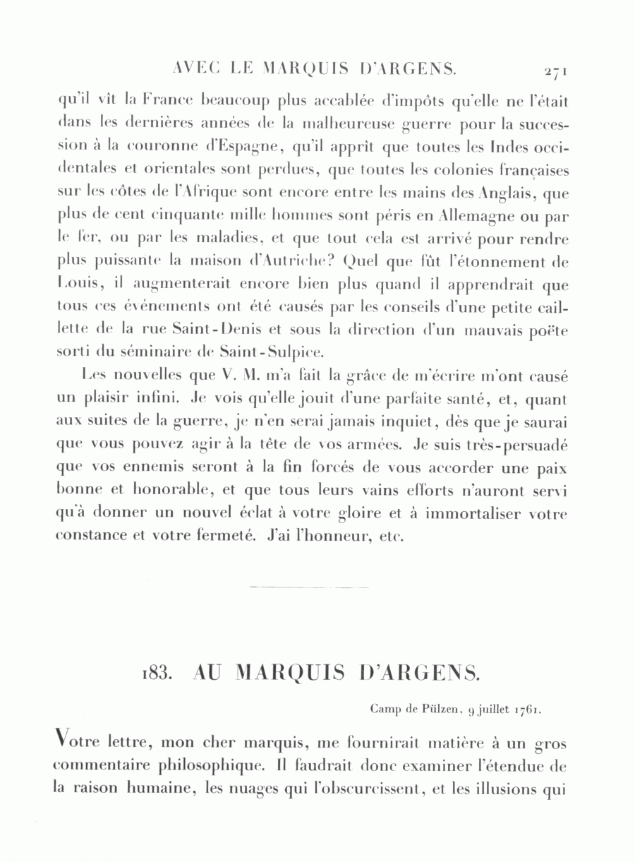 Votre lettre, mon cher marquis, me fournirait matière à un gros commentaire philosophique. Il faudrait donc examiner l'étendue de la raison humaine, les nuages qui l'obscurcissent, et les illusions qui