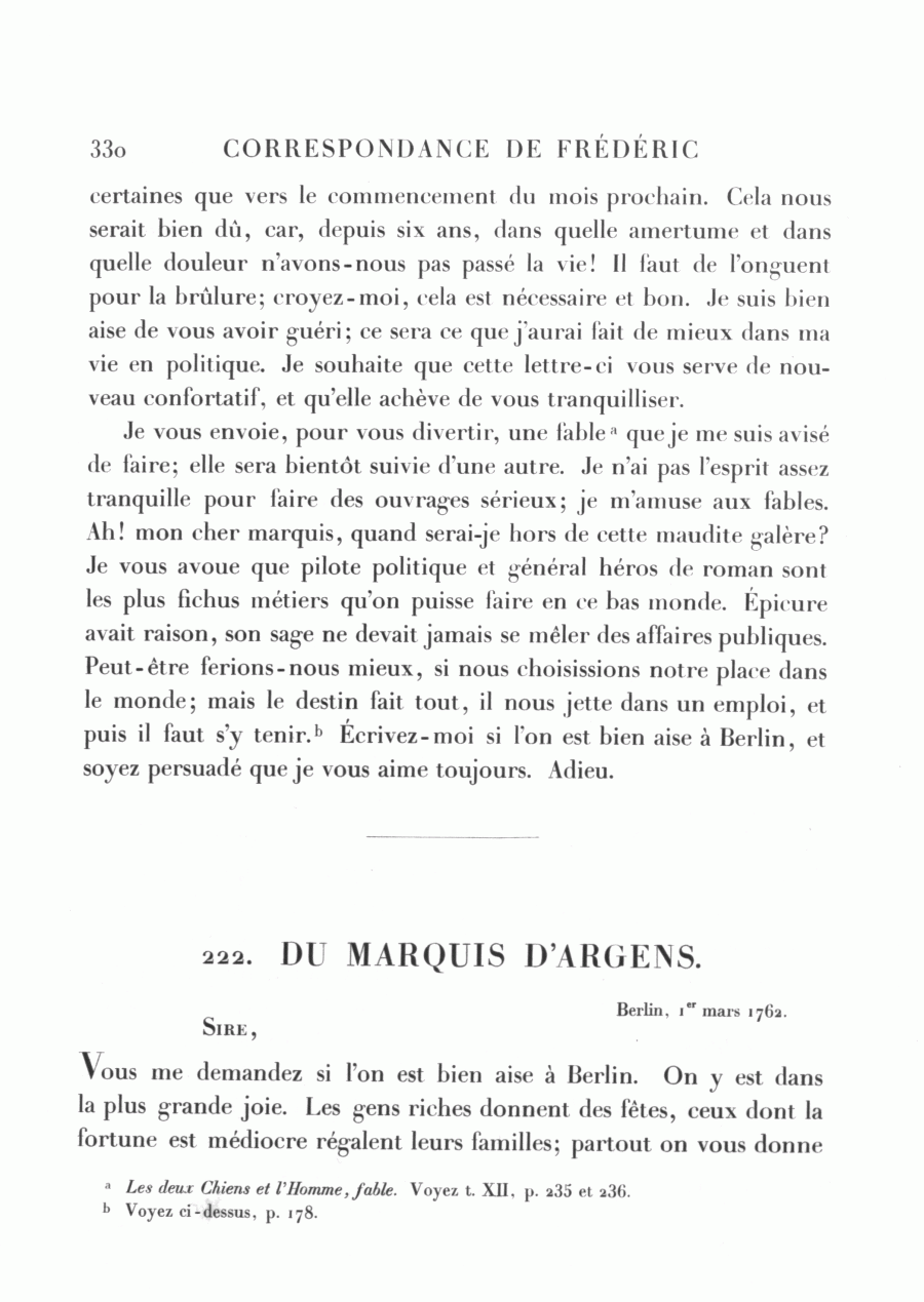 Je vous envoie, pour vous divertir, une fablea que je me suis avisé de faire; elle sera bientôt suivie d'une autre. Je n'ai pas l'esprit assez tranquille pour faire des ouvrages sérieux; je m'amuse aux fables. Ah! mon cher marquis, quand serai-je hors de cette maudite galère? Je vous avoue que pilote politique et général héros de roman sont les plus fichus métiers qu'on puisse faire en ce bas monde. Épicure avait raison, son sage ne devait jamais se mêler des affaires publiques. Peut-être ferions-nous mieux, si nous choisissions notre place dans le monde; mais le destin fait tout, il nous jette dans un emploi, et puis il faut s'y tenir.b Écrivez-moi si l'on est bien aise à Berlin, et soyez persuadé que je vous aime toujours. Adieu.