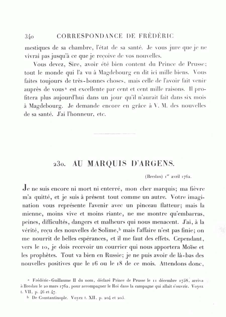 a Frédéric-Guillaume II du nom, déclaré Prince de Prusse le 11 décembre 1758, arriva à Breslau le 20 mars 1762, pour accompagner le Roi dans la campagne qui allait s'ouvrir. Voyez t. VII, p. 46 et 47.