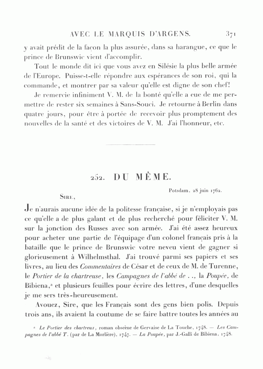 Je n'aurais aucune idée de la politesse française, si je n'employais pas ce qu'elle a de plus galant et de plus recherché pour féliciter V. M. sur la jonction des Russes avec son armée. J'ai été assez heureux pour acheter une partie de l'équipage d'un colonel français pris à la bataille que le prince de Brunswic votre neveu vient de gagner si glorieusement à Wilhelmsthal. Jai trouvé parmi ses papiers et ses livres, au lieu des Commentaires de César et de ceux de M. de Turenne, le Portier de la chartreuse, les Campagnes de l'abbé de .., la Poupée, de Bibiena,a et plusieurs feuilles pour écrire des lettres, d'une desquelles je me sers très-heureusement.