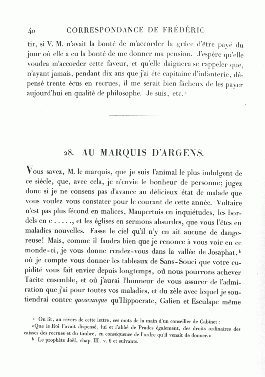 Vous savez, M. le marquis, que je suis l'animal le plus indulgent de ce siècle, que, avec cela, je n'envie le bonheur de personne; jugez donc si je ne consens pas d'avance au délicieux état de malade que vous voulez vous constater pour le courant de cette année. Voltaire n'est pas plus fécond en malices, Maupertuis en inquiétudes, les bordels en c....., et les églises en sermons absurdes, que vous l'êtes en maladies nouvelles. Fasse le ciel qu'il n'y en ait aucune de dangereuse! Mais, comme il faudra bien que je renonce à vous voir en ce monde-ci, je vous donne rendez-vous dans la vallée de Josaphat,b où je compte vous donner les tableaux de Sans-Souci que votre cupidité vous fait envier depuis longtemps, où nous pourrons achever Tacite ensemble, et où j'aurai l'honneur de vous assurer de l'admiration que j'ai pour toutes vos maladies, et du zèle avec lequel je soutiendrai contre quoscunque qu'Hippocrate, Galien et Esculape même