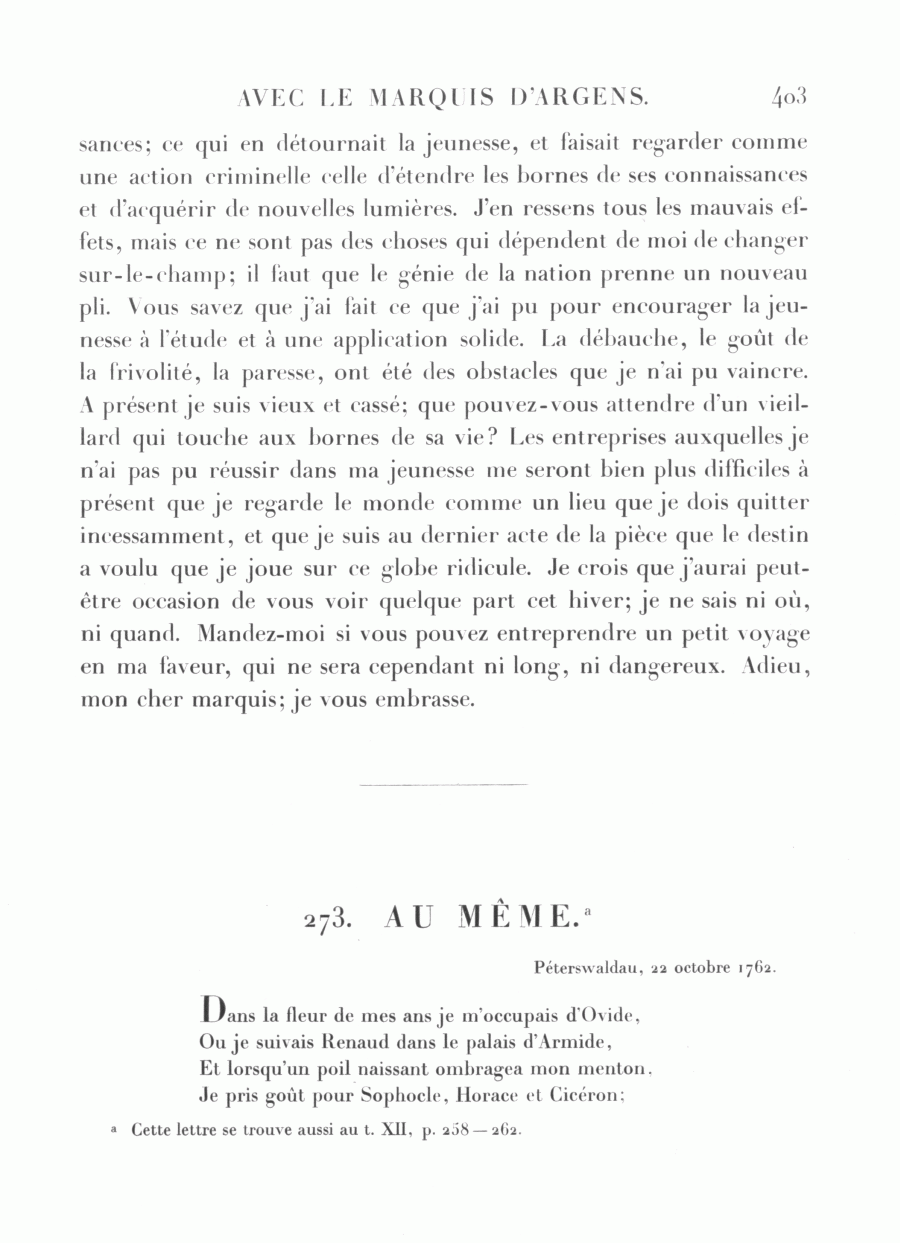 Frédéric au marquis d'Argens, Péterswaldau, 22 octobre 1762Id: d385_ag509-19_002273000