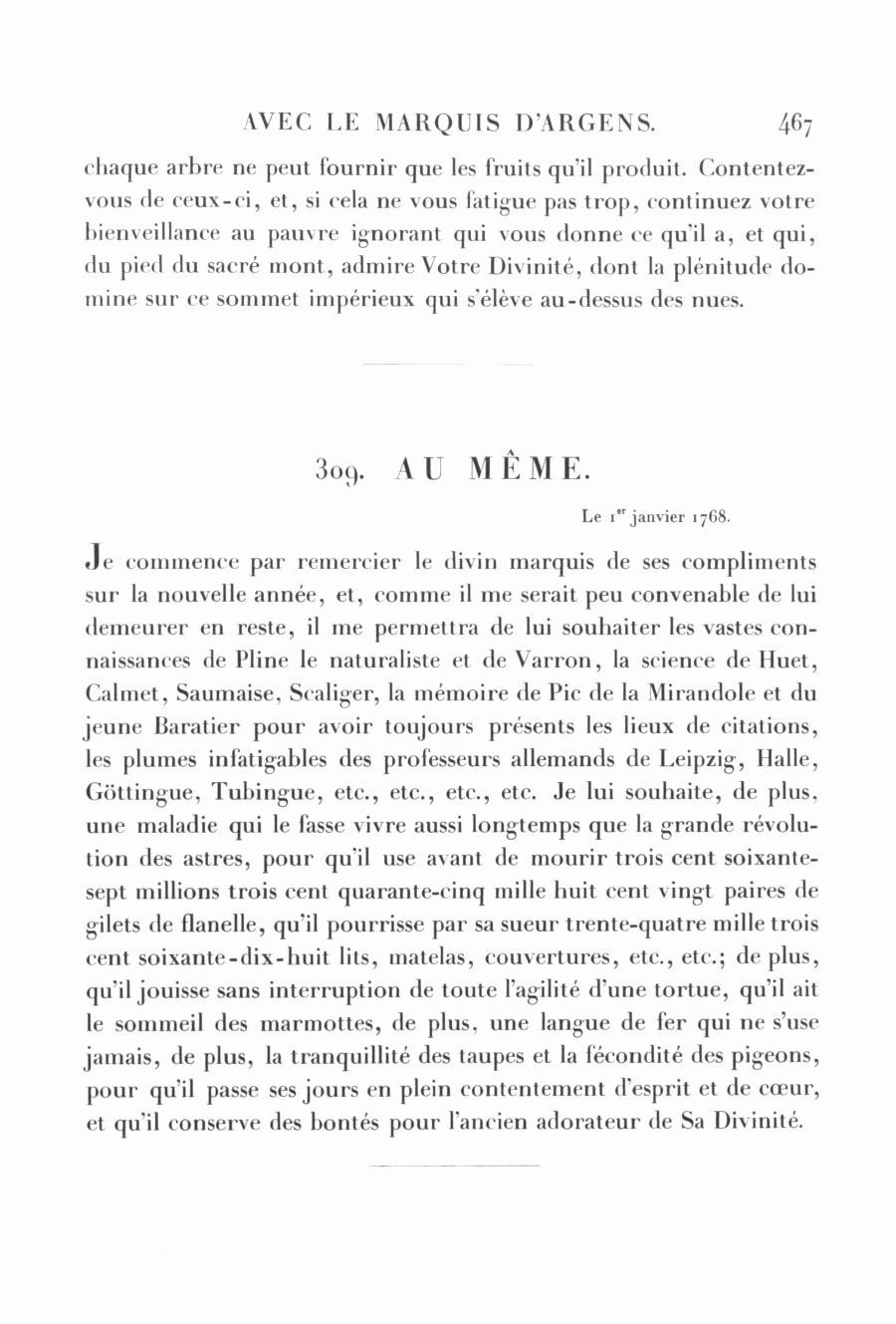 Je commence par remercier le divin marquis de ses compliments sur la nouvelle année, et, comme il me serait peu convenable de lui demeurer en reste, il me permettra de lui souhaiter les vastes connaissances de Pline le naturaliste et de Varron, la science de Huet, Calmet, Saumaise, Scaliger, la mémoire de Pic de la Mirandole et du jeune Baratier pour avoir toujours présents les lieux de citations, les plumes infatigables des professeurs allemands de Leipzig, Halle, Göttingue, Tubingue, etc., etc., etc., etc. Je lui souhaite, de plus, une maladie qui le fasse vivre aussi longtemps que la grande révolution des astres, pour qu'il use avant de mourir trois cent soixante-sept millions trois cent quarante-cinq mille huit cent vingt paires de gilets de flanelle, qu'il pourrisse par sa sueur trente-quatre mille trois cent soixante-dix-huit lits, matelas, couvertures, etc., etc.; de plus, qu'il jouisse sans interruption de toute l'agilité d'une tortue, qu'il ait le sommeil des marmottes, de plus, une langue de fer qui ne s'use jamais, de plus, la tranquillité des taupes et la fécondité des pigeons, pour qu'il passe ses jours en plein contentement d'esprit et de cœur, et qu'il conserve des bontés pour l'ancien adorateur de Sa Divinité.
