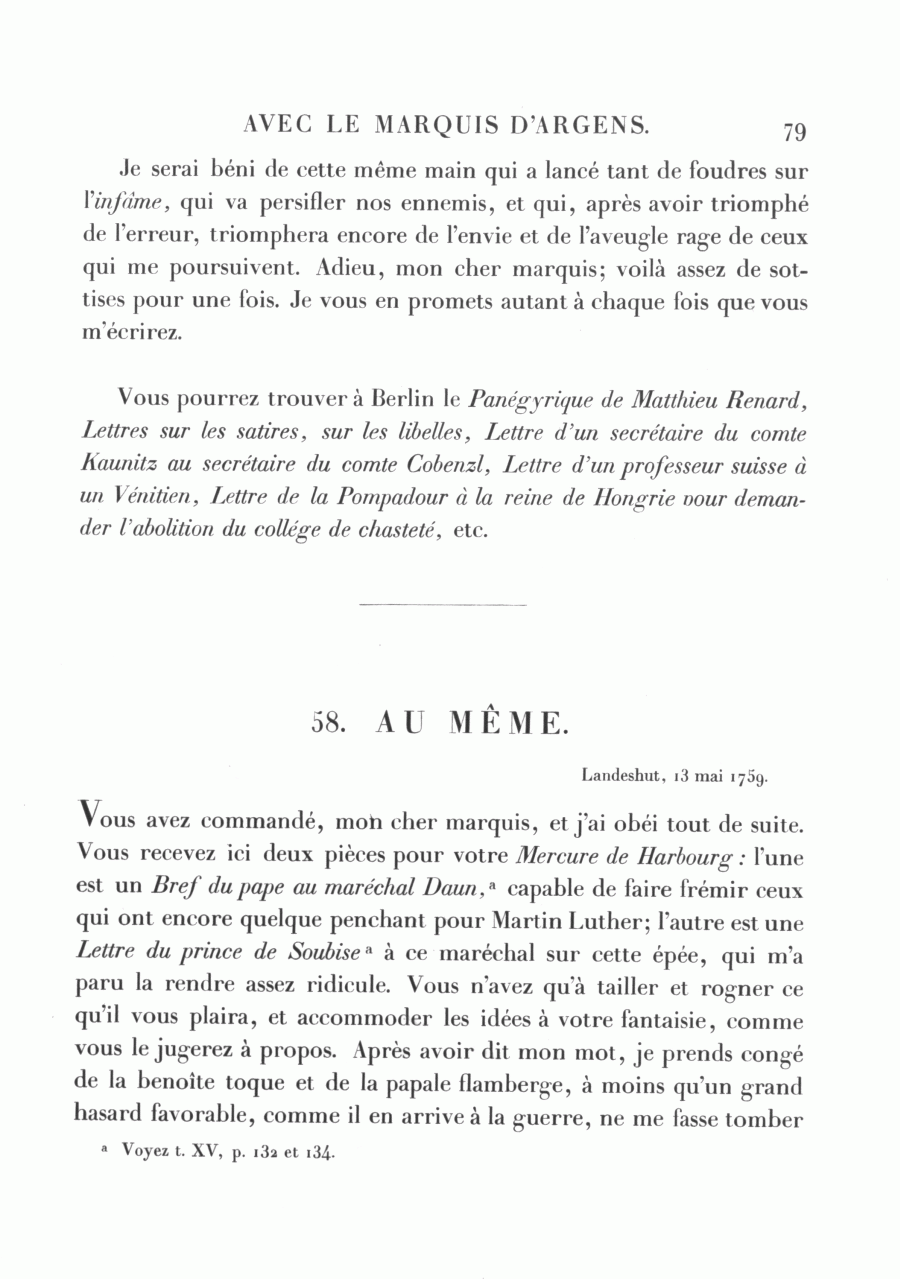 Vous avez commandé, mon cher marquis, et j'ai obéi tout de suite. Vous recevez ici deux pièces pour votre Mercure de Harbourg : l'une est un Bref du pape au maréchal Daun,a capable de faire frémir ceux qui ont encore quelque penchant pour Martin Luther; l'autre est une Lettre du prince de Soubisea à ce maréchal sur cette épée, qui m'a paru la rendre assez ridicule. Vous n'avez qu'à tailler et rogner ce qu'il vous plaira, et accommoder les idées à votre fantaisie, comme vous le jugerez à propos. Après avoir dit mon mot, je prends congé de la benoîte toque et de la papale flamberge, à moins qu'un grand hasard favorable, comme il en arrive à la guerre, ne me fasse tomber