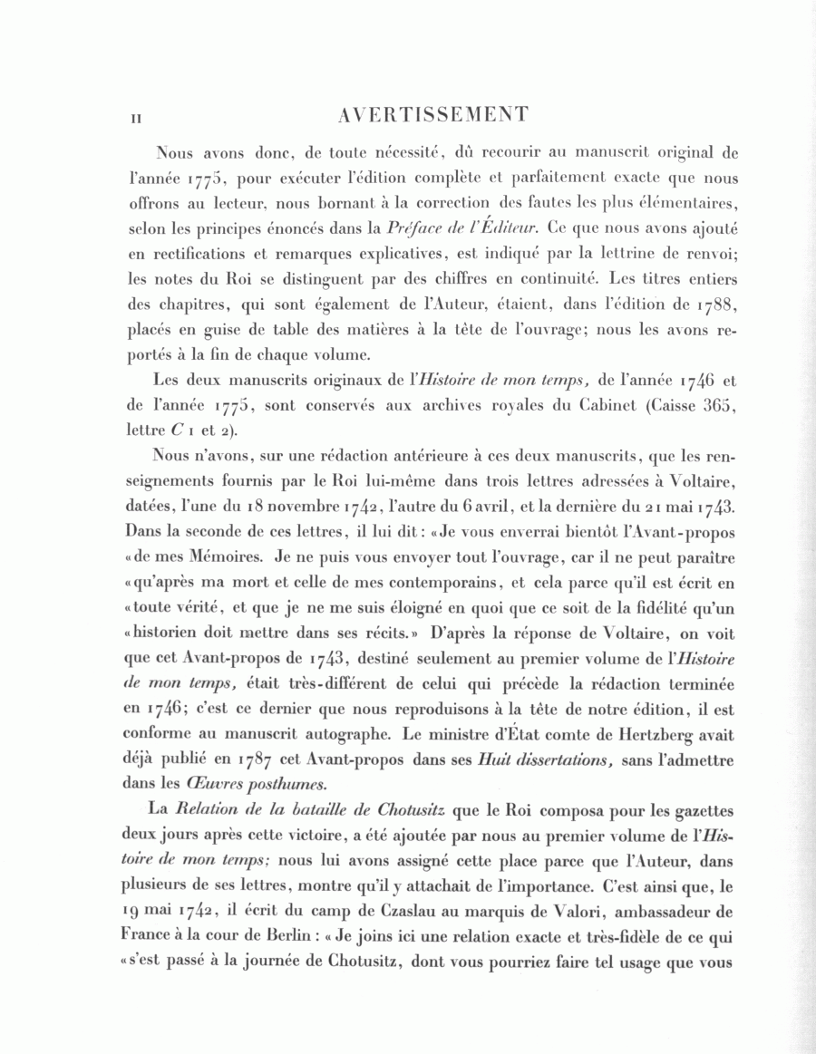 Nous n'avons, sur une rédaction antérieure à ces deux manuscrits, que les renseignements fournis par le Roi lui-même dans trois lettres adressées à Voltaire, datées, l'une du 18 novembre 1742, l'autre du 6 avril, et la dernière du 21 mai 1743. Dans la seconde de ces lettres, il lui dit : « Je vous enverrai bientôt l'Avant-propos de mes Mémoires. Je ne puis vous envoyer tout l'ouvrage, car il ne peut paraître qu'après ma mort et celle de mes contemporains, et cela parce qu'il est écrit en toute vérité, et que je ne me suis éloigné en quoi que ce soit de la fidélité qu'un historien doit mettre dans ses récits. » D'après la réponse de Voltaire, on voit que cet Avant-propos de 1743, destiné seulement au premier volume de l'Histoire de mon temps, était très - différent de celui qui précède la rédaction terminée en 1746; c'est ce dernier que nous reproduisons à la tête de notre édition, il est conforme au manuscrit autographe. Le ministre d'Etat comte de Hertzberg avait déjà publié en 1787 cet Avant-propos dans ses Huit dissertations, sans l'admettre dans les Œuvres posthumes.
