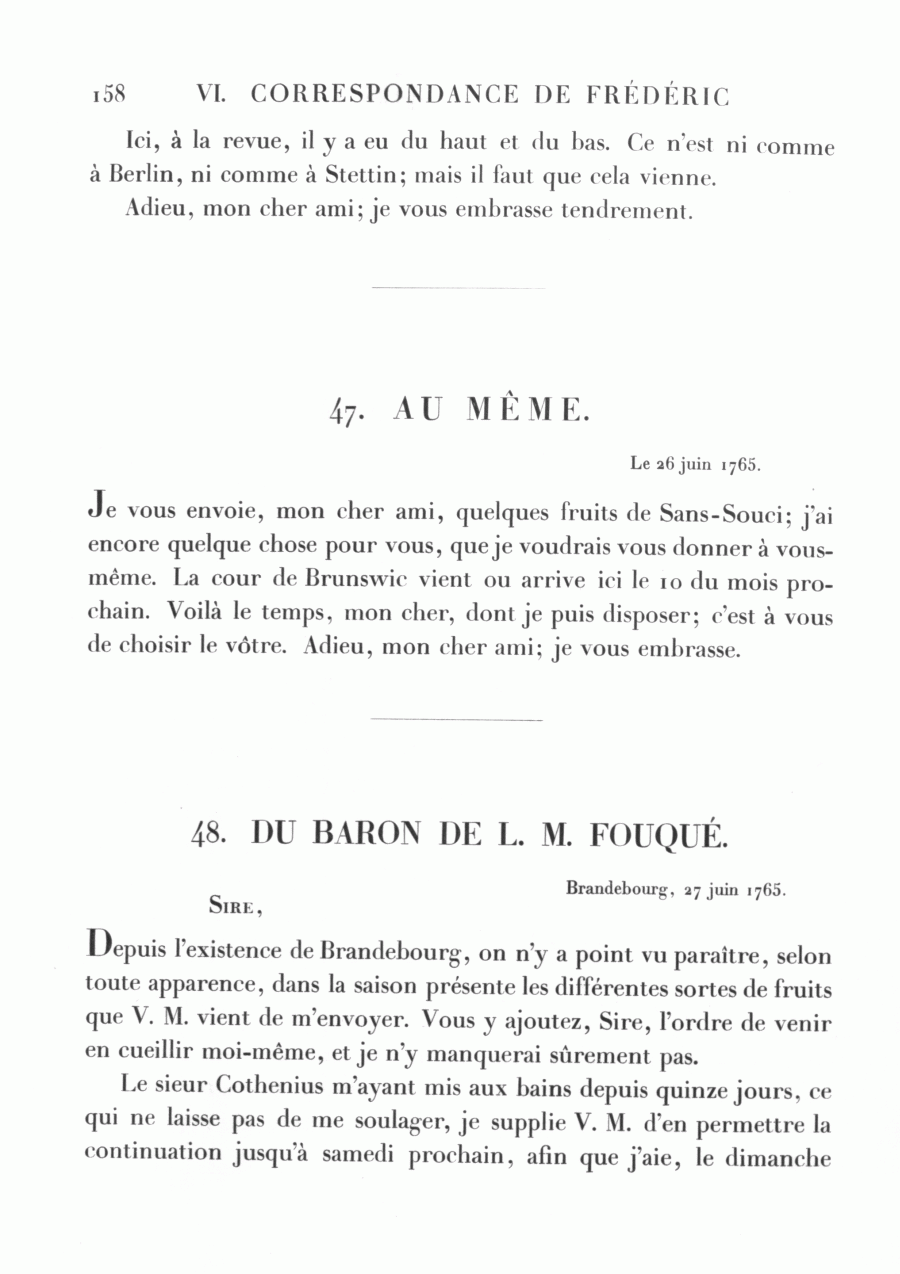 Je vous envoie, mon cher ami, quelques fruits de Sans-Souci; j'ai encore quelque chose pour vous, que je voudrais vous donner à vous-même. La cour de Brunswic vient ou arrive ici le 10 du mois prochain. Voilà le temps, mon cher, dont je puis disposer; c'est à vous de choisir le vôtre. Adieu, mon cher ami; je vous embrasse.