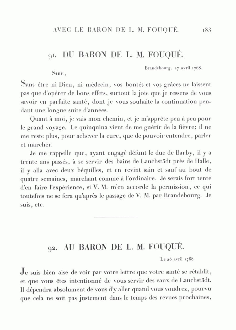 Frédéric au baron de L. M. Fouqué, le 28 avril 1768