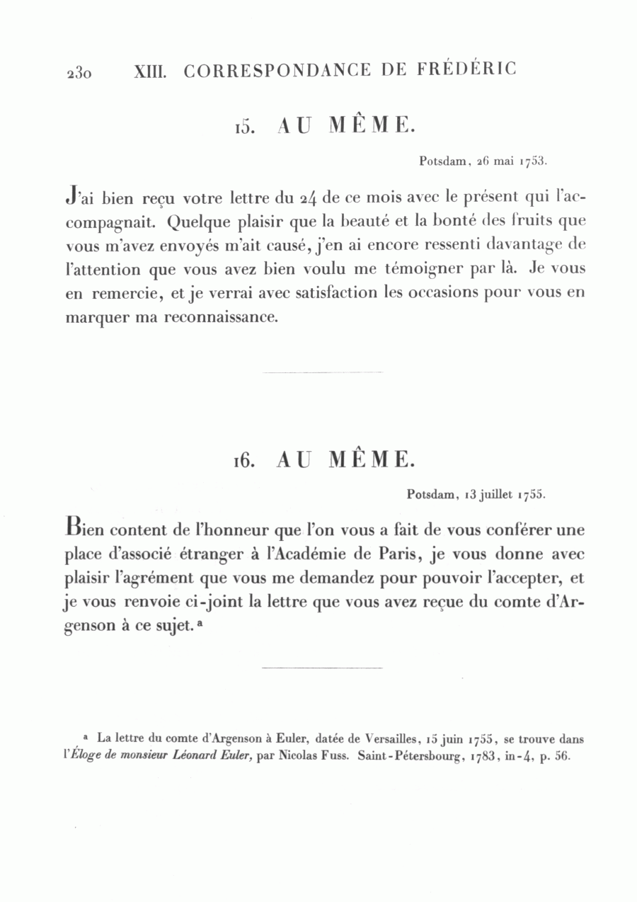 a La lettre du comte d'Argenson à Euler, datée de Versailles, 15 juin 1755, se trouve dans l'Éloge de monsieur Léonard Euler, par Nicolas Fuss. Saint-Pétersbourg, 1783, in-4, p. 56.