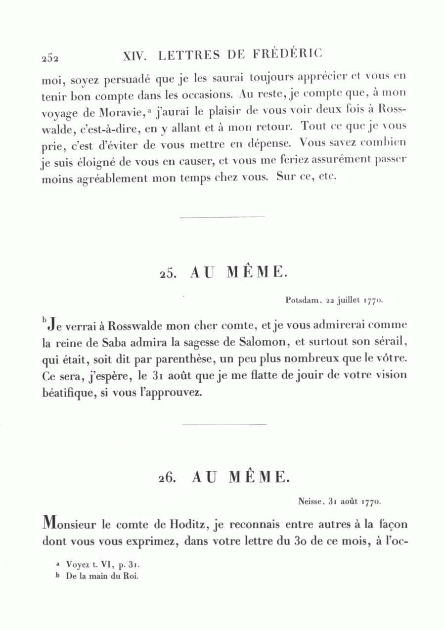 <252> moi, soyez persuadé que je les saurai toujours apprécier et vous en tenir bon compte dans les occasions. Au reste, je compte que, à mon voyage de Moravie,a j'aurai le plaisir de vous voir deux fois à Rosswalde, c'est-à-dire, en y allant et à mon retour. Tout ce que je vous prie, c'est d'éviter de vous mettre en dépense. Vous savez combien je suis éloigné de vous en causer, et vous me feriez assurément passer moins agréablement mon temps chez vous. Sur ce, etc.