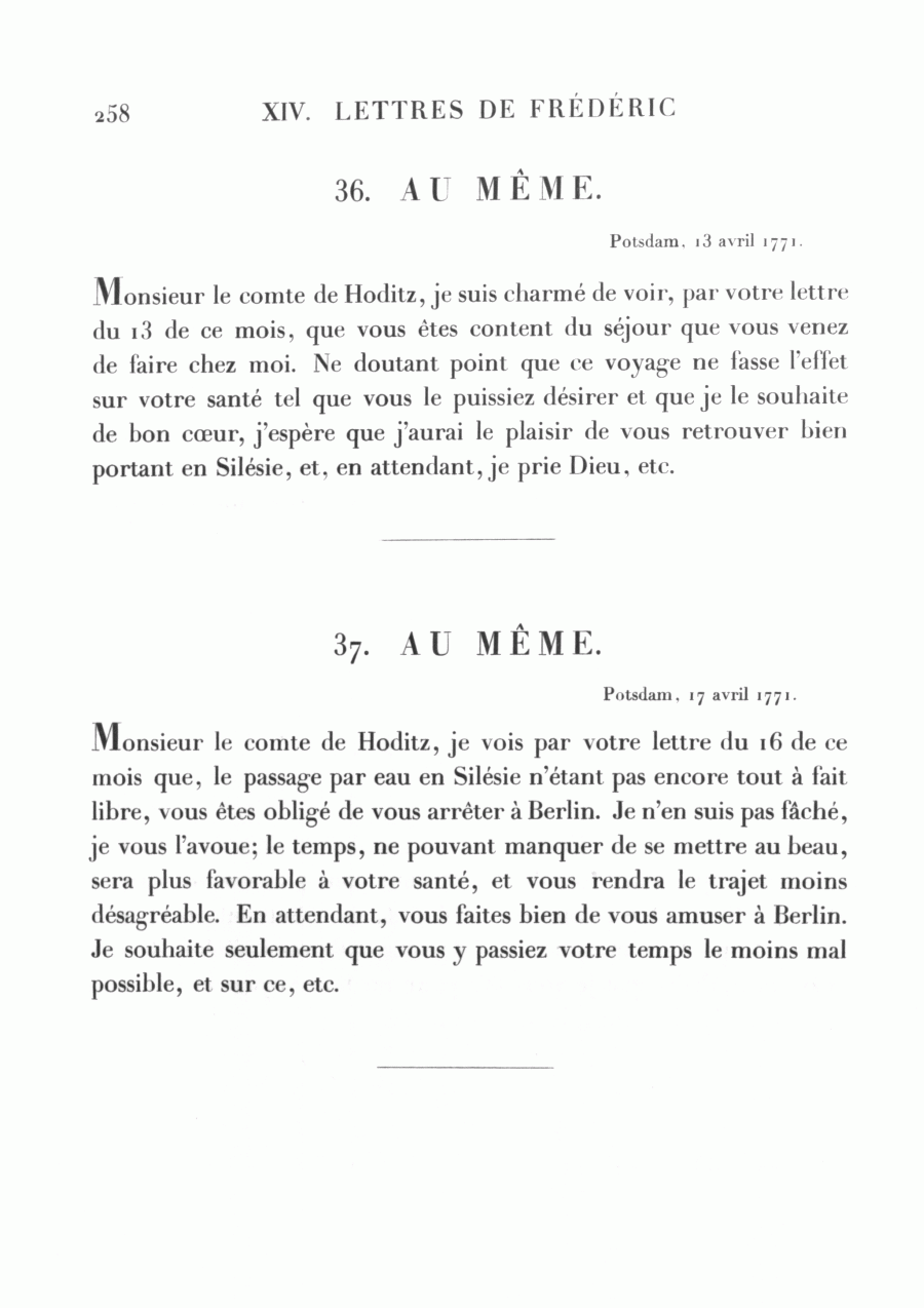 Monsieur le comte de Hoditz, je suis charmé de voir, par votre lettre du 13 de ce mois, que vous êtes content du séjour que vous venez de faire chez moi. Ne doutant point que ce voyage ne fasse l'effet sur votre santé tel que vous le puissiez désirer et que je le souhaite de bon cœur, j'espère que j'aurai le plaisir de vous retrouver bien portant en Silésie, et, en attendant, je prie Dieu, etc.