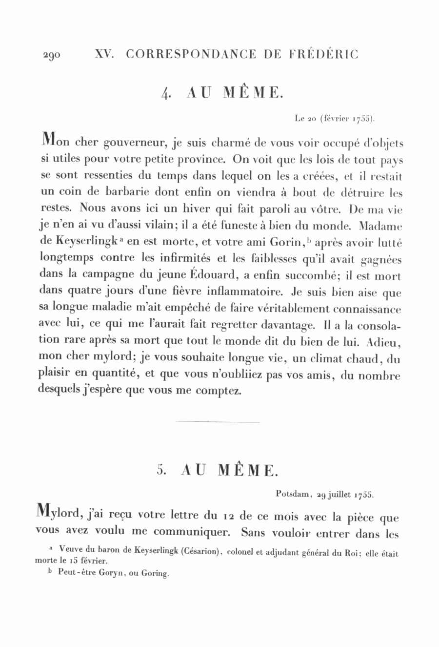Mon cher gouverneur, je suis charmé de vous voir occupé d'objets si utiles pour votre petite province. On voit que les lois de tout pays se sont ressenties du temps dans lequel on les a créées, et il restait un coin de barbarie dont enfin on viendra à bout de détruire les restes. Nous avons ici un hiver qui fait paroli au vôtre. De ma vie je n'en ai vu d'aussi vilain; il a été funeste à bien du inonde. Madame de Keyserlingka en est morte, et votre ami Gorin,b après avoir lutté longtemps contre les infirmités et les faiblesses qu'il avait gagnées dans la campagne du jeune Édouard, a enfin succombé; il est mort dans quatre jours d'une fièvre inflammatoire. Je suis bien aise que sa longue maladie m'ait empêché de faire véritablement connaissance avec lui, ce qui me l'aurait fait regretter davantage. Il a la consolation rare après sa mort que tout le monde dit du bien de lui. Adieu, mon cher mylord; je vous souhaite longue vie, un climat chaud, du plaisir en quantité, et que vous n'oubliiez pas vos amis, du nombre desquels j'espère que vous me comptez.