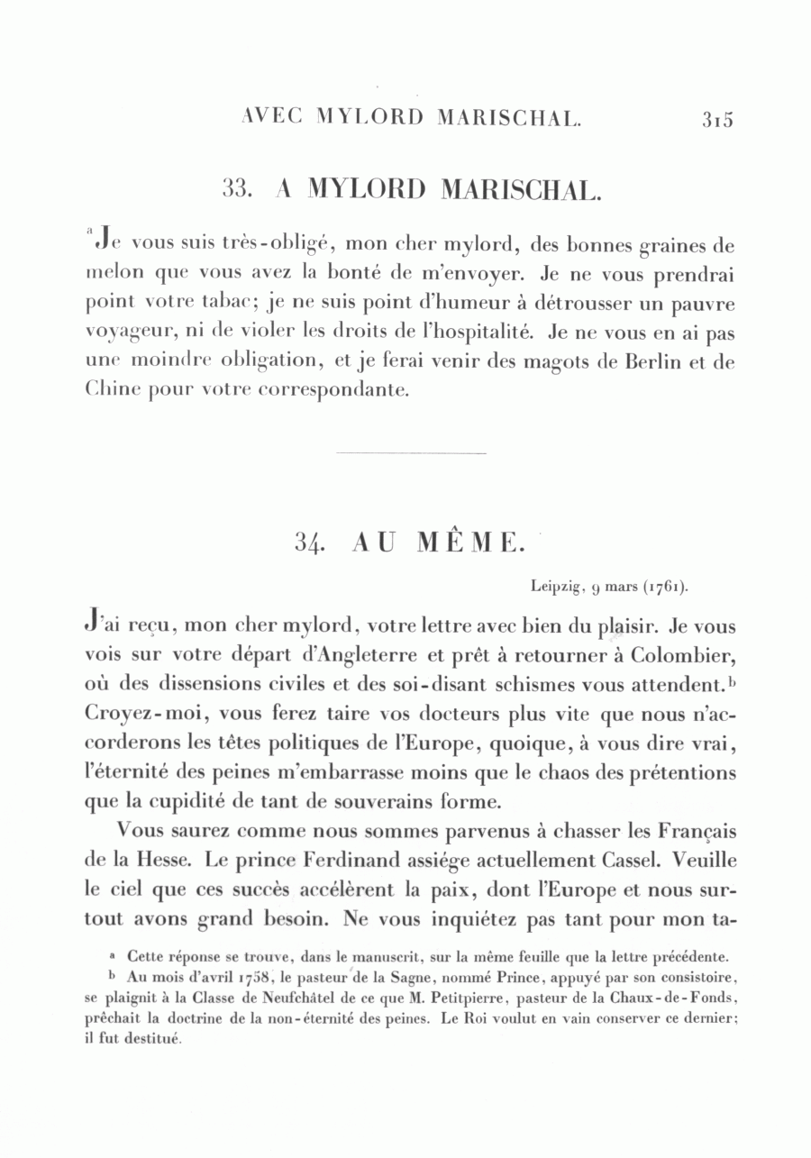J'ai reçu, mon cher mylord, votre lettre avec bien du plaisir. Je vous vois sur votre départ d'Angleterre et prêt à retourner à Colombier, où des dissensions civiles et des soi-disant schismes vous attendent.b Croyez-moi, vous ferez taire vos docteurs plus vite que nous n'accorderons les têtes politiques de l'Europe, quoique, à vous dire vrai, l'éternité des peines m'embarrasse moins que le chaos des prétentions que la cupidité de tant de souverains forme.