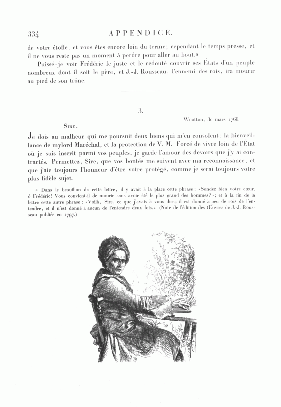 a Dans le brouillon de cette lettre, il y avait à la place cette phrase : « Sondez bien votre cœur, ô Frédéric! Vous convient-il de mourir sans avoir été le plus grand des hommes? »; et à la fin de la lettre cette autre phrase : « Voilà, Sire, ce que j'avais à vous dire; il est donné à peu de rois de l'entendre, et il n'est donné à aucun de l'entendre deux fois. » (Note de l'édition des Œuvres de J.-J. Rousseau publiée en 1797.)