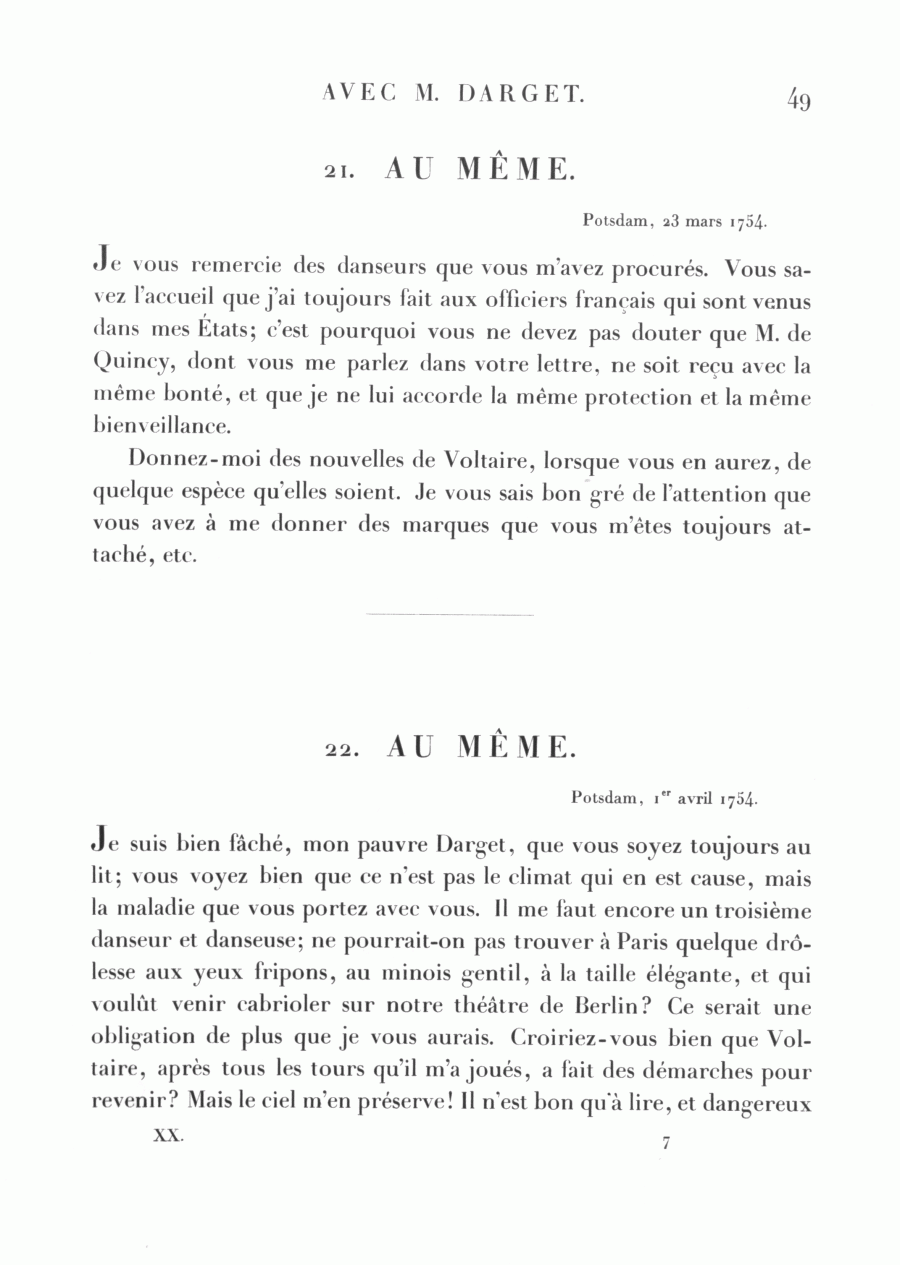 Je suis bien fâché, mon pauvre Darget, que vous soyez toujours au lit; vous voyez bien que ce n'est pas le climat qui en est cause, mais la maladie que vous portez avec vous. Il me faut encore un troisième danseur et danseuse; ne pourrait-on pas trouver à Paris quelque drôlesse aux yeux fripons, au minois gentil, à la taille élégante, et qui voulût venir cabrioler sur notre théâtre de Berlin? Ce serait une obligation de plus que je vous aurais. Croiriez-vous bien que Voltaire, après tous les tours qu'il m'a joués, a fait des démarches pour revenir? Mais le ciel m'en préserve! Il n'est bon qu'à lire, et dangereux