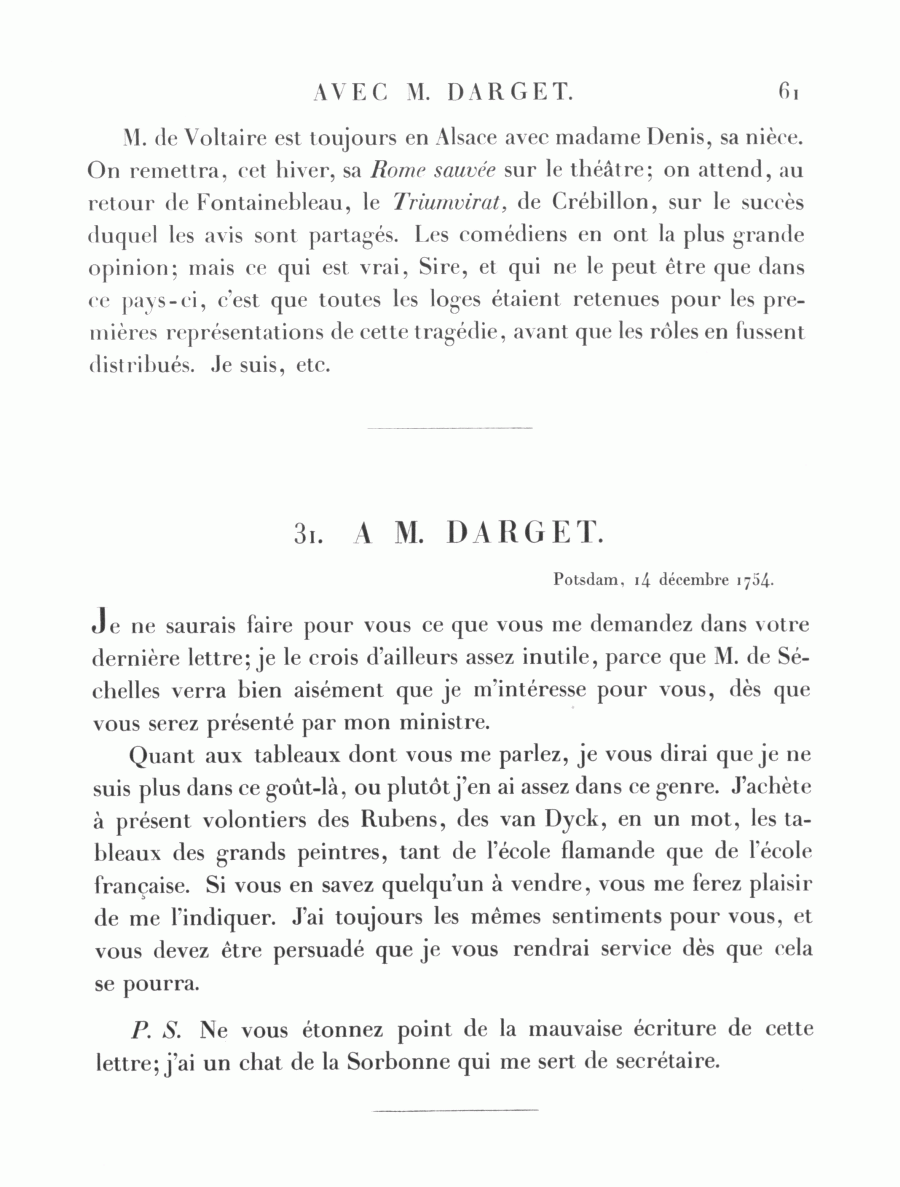 P. S. Ne vous étonnez point de la mauvaise écriture de cette lettre; j'ai un chat de la Sorbonne qui me sert de secrétaire.