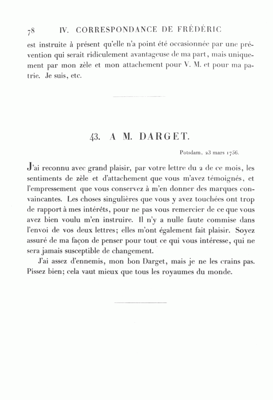 J'ai assez d'ennemis, mon bon Darget, mais je ne les crains pas. Pissez bien; cela vaut mieux que tous les royaumes du monde.