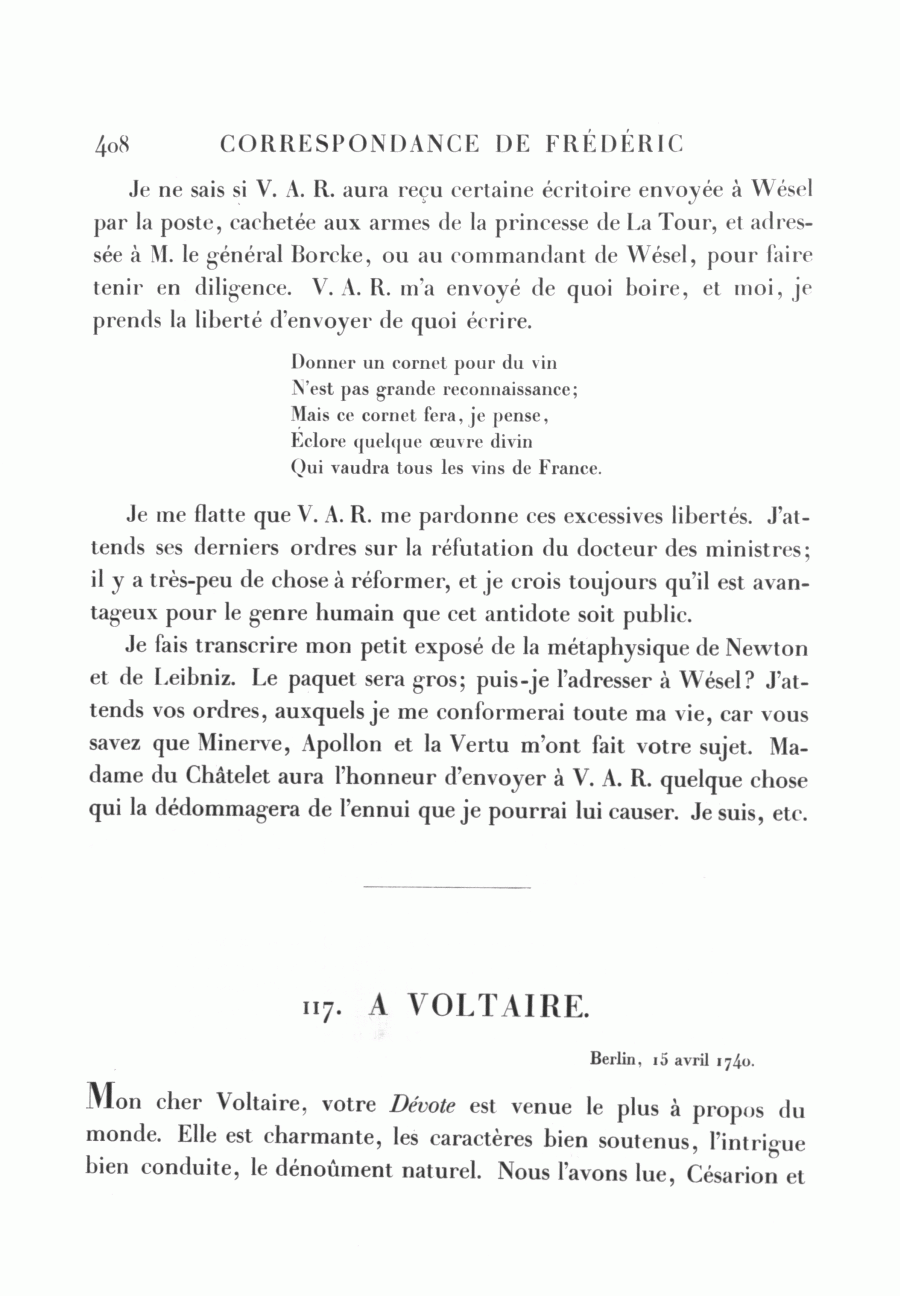 <408>Je ne sais si V. A. R. aura reçu certaine écritoire envoyée à Wésel par la poste, cachetée aux armes de la princesse de La Tour, et adressée à M. le général Borcke, ou au commandant de Wésel, pour faire tenir en diligence. V. A. R. m'a envoyé de quoi boire, et moi, je prends la liberté d'envoyer de quoi écrire.