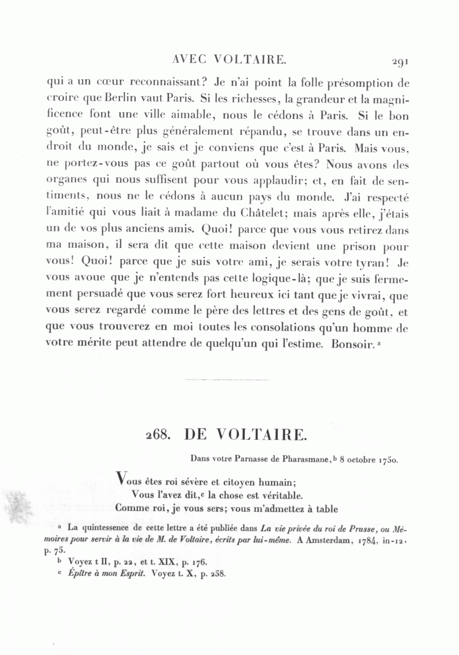 <291> qui a un cœur reconnaissant? Je n'ai point la folle présomption de croire que Berlin vaut Paris. Si les richesses, la grandeur et la magnificence font une ville aimable, nous le cédons à Paris. Si le bon goût, peut-être plus généralement répandu, se trouve dans un endroit du monde, je sais et je conviens que c'est à Paris. Mais vous, ne portez-vous pas ce goût partout où vous êtes? Nous avons des organes qui nous suffisent pour vous applaudir; et, en fait de sentiments, nous ne le cédons à aucun pays du monde. J'ai respecté l'amitié qui vous liait à madame du Châtelet; mais après elle, j'étais un de vos plus anciens amis. Quoi! parce que vous vous retirez dans ma maison, il sera dit que cette maison devient une prison pour vous! Quoi! parce que je suis votre ami, je serais votre tyran! Je vous avoue que je n'entends pas cette logique-là; que je suis fermement persuadé que vous serez fort heureux ici tant que je vivrai, que vous serez regardé comme le père des lettres et des gens de goût, et que vous trouverez en moi toutes les consolations qu'un homme de votre mérite peut attendre de quelqu'un qui l'estime. Bonsoir.a