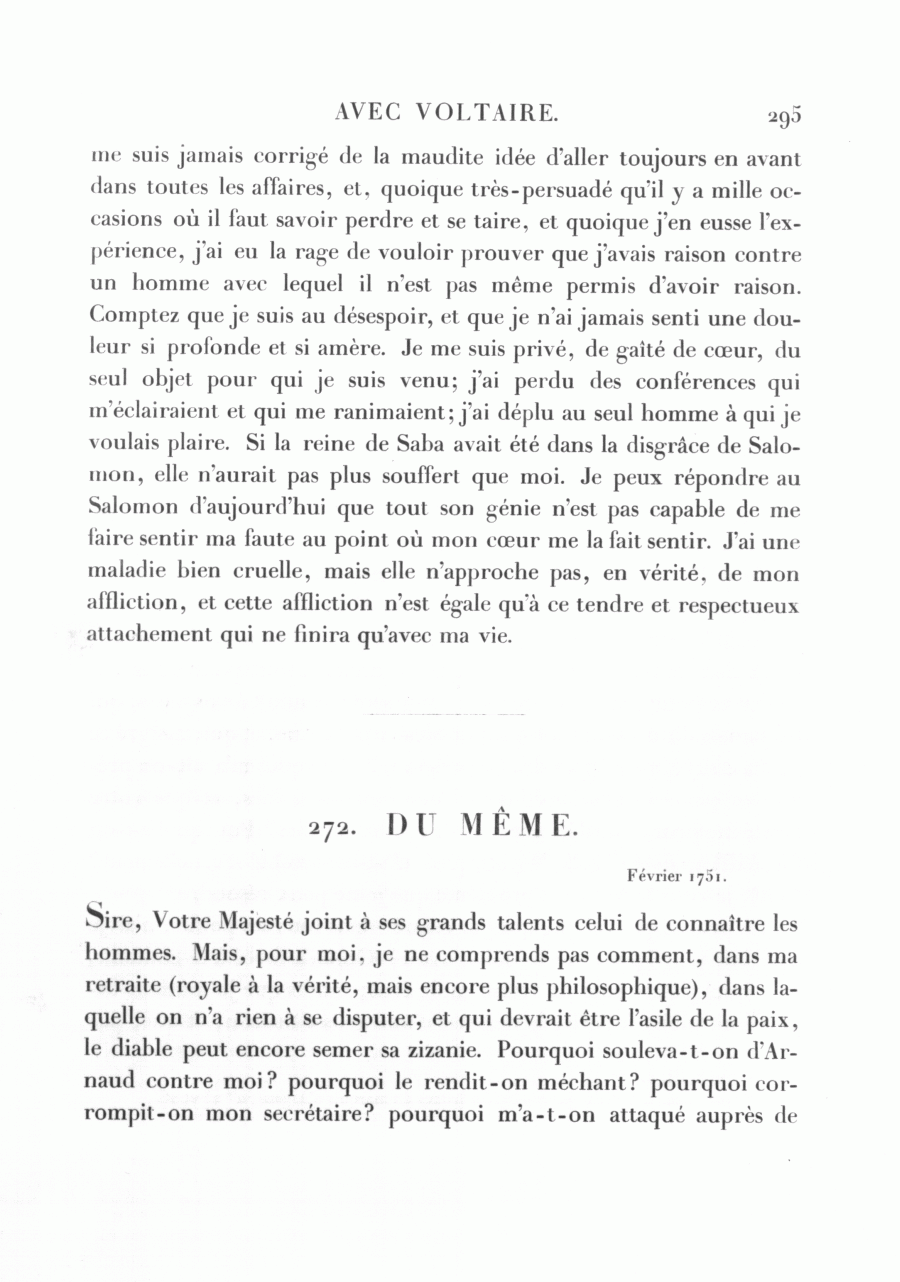 Sire, Votre Majesté joint à ses grands talents celui de connaître les hommes. Mais, pour moi. je ne comprends pas comment, dans ma retraite (royale à la vérité, mais encore plus philosophique), dans laquelle on n'a rien à se disputer, et qui devrait être l'asile de la paix, le diable peut encore semer sa zizanie. Pourquoi souleva-t-on d'Arnaud contre moi? pourquoi le rendit-on méchant? pourquoi corrompit-on mon secrétaire? pourquoi m'a-t-on attaqué auprès de
