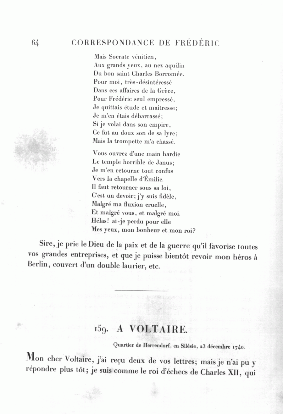Mon cher Voltaire, j'ai reçu deux de vos lettres; mais je n'ai pu y répondre plus tôt; je suis comme le roi d'échecs de Charles XII, qui