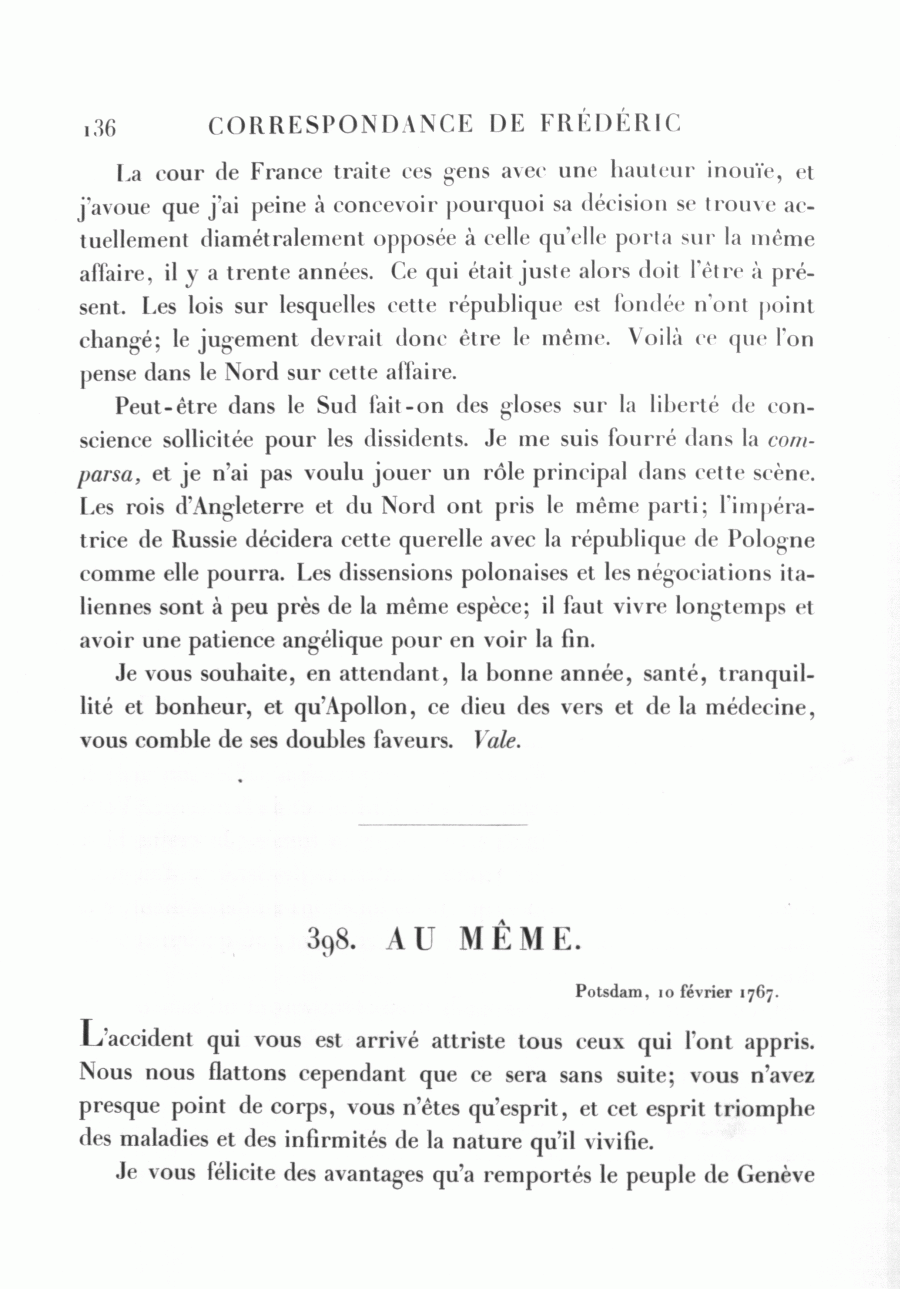 L'accident qui vous est arrivé attriste tous ceux qui l'ont appris. Nous nous flattons cependant que ce sera sans suite; vous n'avez presque point de corps, vous n'êtes qu'esprit, et cet esprit triomphe des maladies et des infirmités de la nature qu'il vivifie.