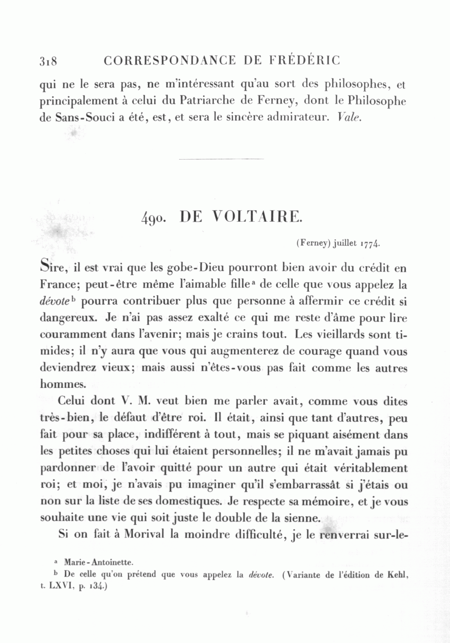 Sire, il est vrai que les gobe-Dieu pourront bien avoir du crédit en France; peut-être même l'aimable fillea de celle que vous appelez la dévoteb pourra contribuer plus que personne à affermir ce crédit si dangereux. Je n'ai pas assez exalté ce qui me reste d'âme pour lire couramment dans l'avenir; mais je crains tout. Les vieillards sont timides; il n'y aura que vous qui augmenterez de courage quand vous deviendrez vieux; mais aussi n'êtes-vous pas fait comme les autres hommes.