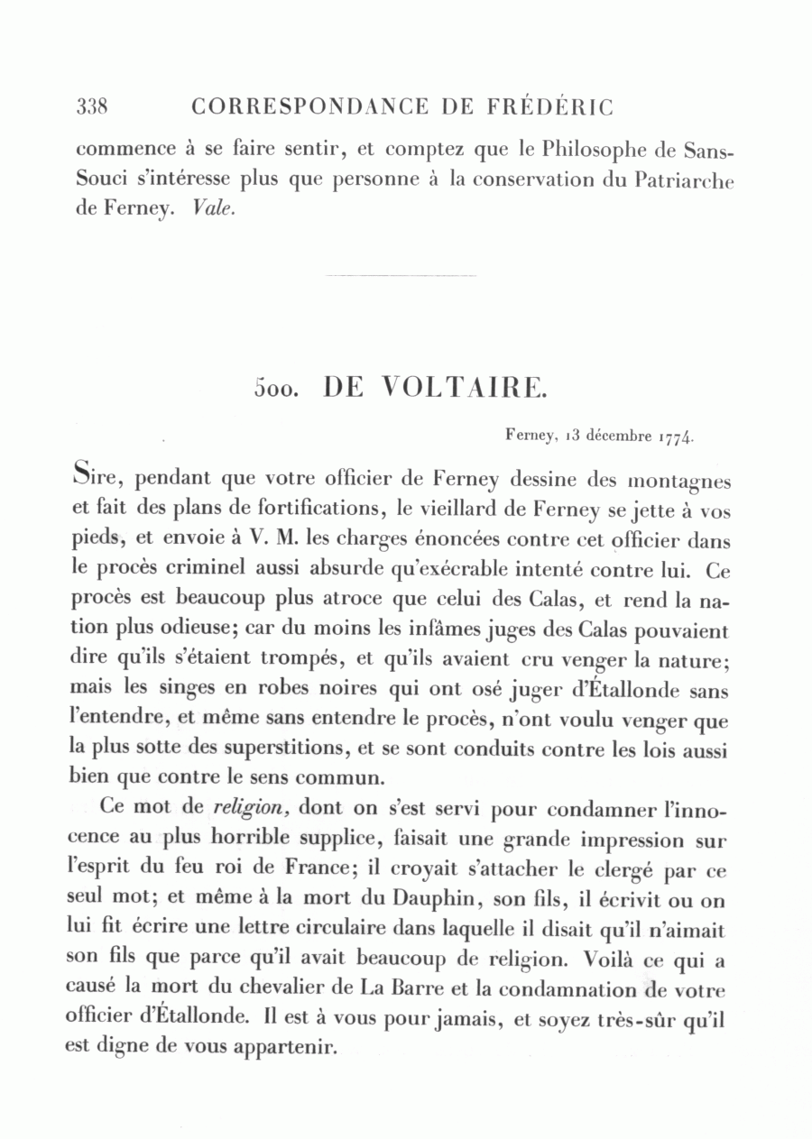 Sire, pendant que votre officier de Ferney dessine des montagnes et fait des plans de fortifications, le vieillard de Ferney se jette à vos pieds, et envoie à V. M. les charges énoncées contre cet officier dans le procès criminel aussi absurde qu'exécrable intenté contre lui. Ce procès est beaucoup plus atroce que celui des Calas, et rend la nation plus odieuse; car du moins les infâmes juges des Calas pouvaient dire qu'ils s'étaient trompés, et qu'ils avaient cru venger la nature; mais les singes en robes noires qui ont osé juger d'Étallonde sans l'entendre, et même sans entendre le procès, n'ont voulu venger que la plus sotte des superstitions, et se sont conduits contre les lois aussi bien que contre le sens commun.