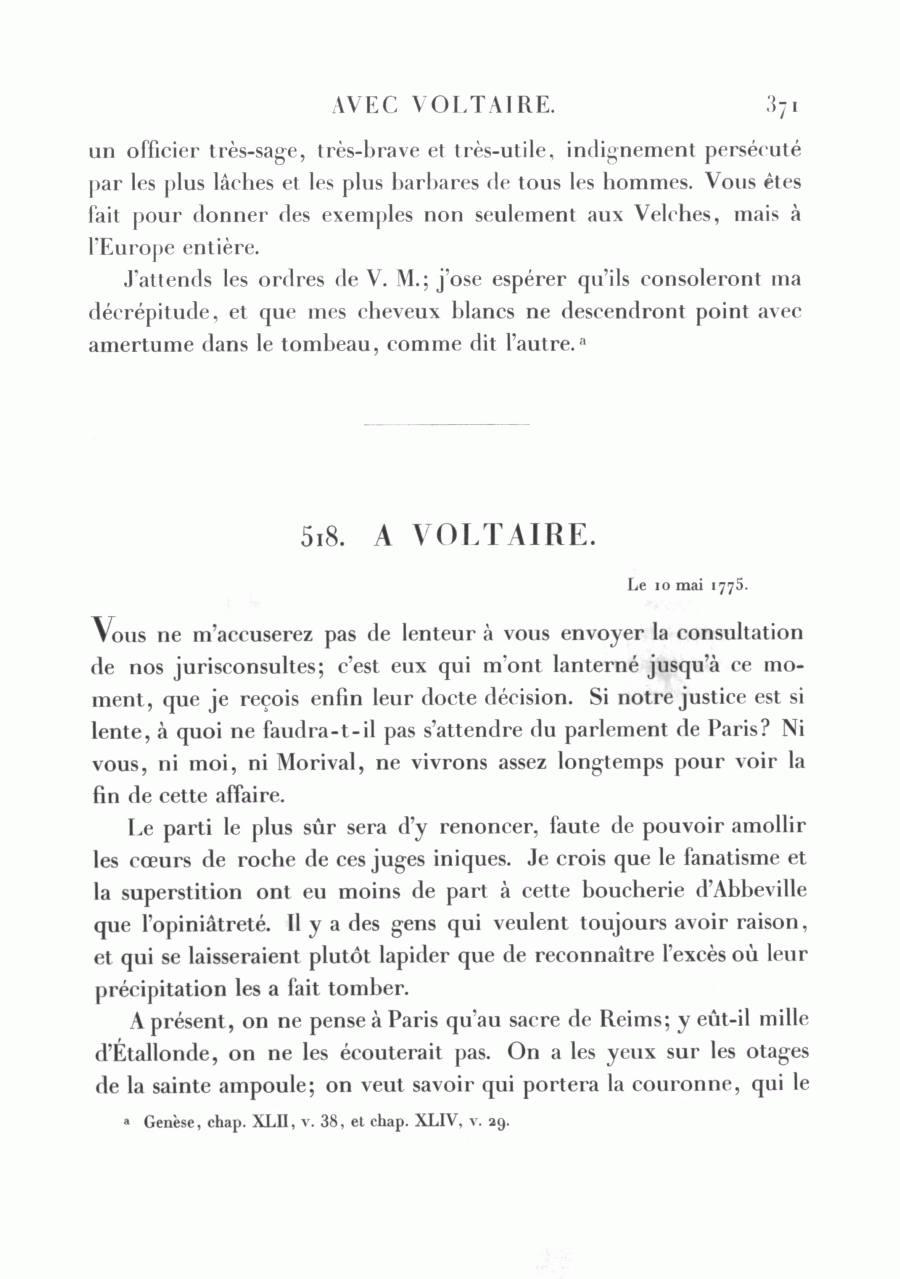 <371> un officier très-sage, très-brave et très-utile, indignement persécuté par les plus lâches et les plus barbares de tous les hommes. Vous êtes fait pour donner des exemples non seulement aux Velches, mais à l'Europe entière.