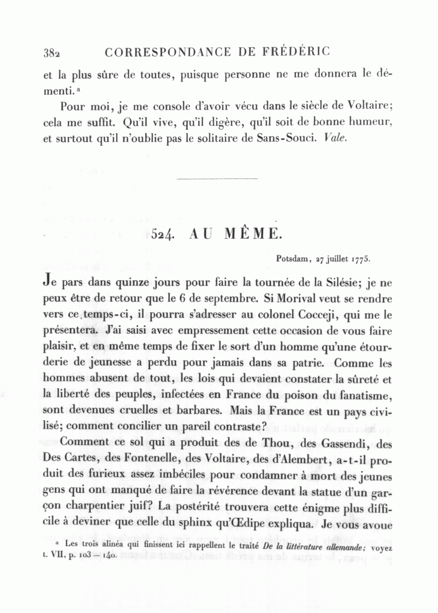 Pour moi, je me console d'avoir vécu dans le siècle de Voltaire; cela me suffit. Qu'il vive, qu'il digère, qu'il soit de bonne humeur, et surtout qu'il n'oublie pas le solitaire de Sans-Souci. Vale.