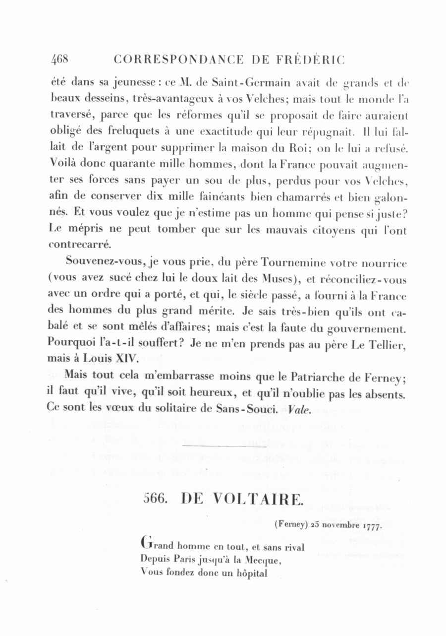 Mais tout cela m'embarrasse moins que le Patriarche de Ferney; il faut qu'il vive, qu'il soit heureux, et qu'il n'oublie pas les absents. Ce sont les vœux du solitaire de Sans-Souci. Vale.