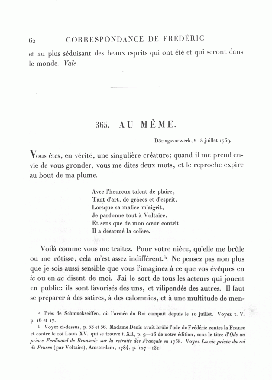 b Voyez ci-dessus, p. 53 et 56. Madame Denis avait brûlé l'ode de Frédéric contre la France et contre le roi Louis XV, qui se trouve t. XII, p. 9-16 de notre édition, sous le titre d'Ode au prince Ferdinand de Brunswic sur la retraite des Français en 1758. Voyez La vie privée du roi de Prusse (par Voltaire), Amsterdam, 1784, p. 127-131.