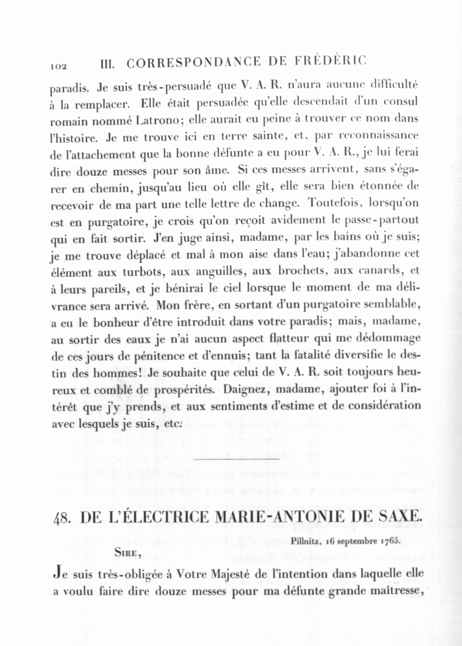 <102> paradis. Je suis très-persuadé que V. A. R. n'aura aucune difficulté à la remplacer. Elle était persuadée qu'elle descendait d'un consul romain nommé Latrono; elle aurait eu peine à trouver ce nom dans l'histoire. Je me trouve ici en terre sainte, et, par reconnaissance de l'attachement que la bonne défunte a eu pour V. A. R., je lui ferai dire douze messes pour son âme. Si ces messes arrivent, sans s'égarer en chemin, jusqu'au lieu où elle gît, elle sera bien étonnée de recevoir de ma part une telle lettre de change. Toutefois, lorsqu'on est en purgatoire, je crois qu'on reçoit avidement le passe-partout qui en fait sortir. J'en juge ainsi, madame, par les bains où je suis; je me trouve déplacé et mal à mon aise dans l'eau; j'abandonne cet élément aux turbots, aux anguilles, aux brochets, aux canards, et à leurs pareils, et je bénirai le ciel lorsque le moment de ma délivrance sera arrivé. Mon frère, en sortant d'un purgatoire semblable, a eu le bonheur d'être introduit dans votre paradis; mais, madame, au sortir des eaux je n'ai aucun aspect flatteur qui me dédommage de ces jours de pénitence et d'ennuis; tant la fatalité diversifie le destin des hommes! Je souhaite que celui de V. A. R. soit toujours heureux et comblé de prospérités. Daignez, madame, ajouter foi à l'intérêt que j'y prends, et aux sentiments d'estime et de considération avec lesquels je suis, etc.